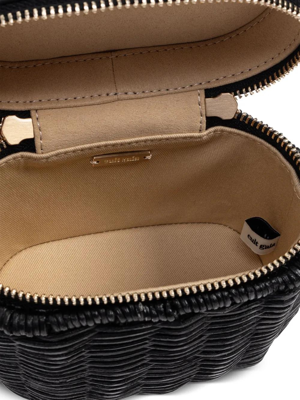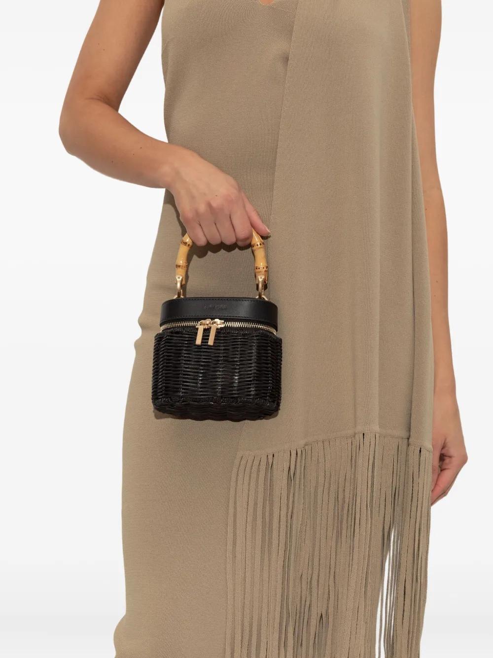 black woven texture bamboo top handle zip fastening leather trim detachable shoulder strap