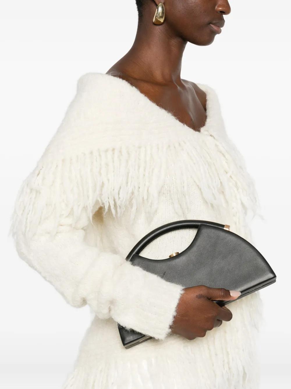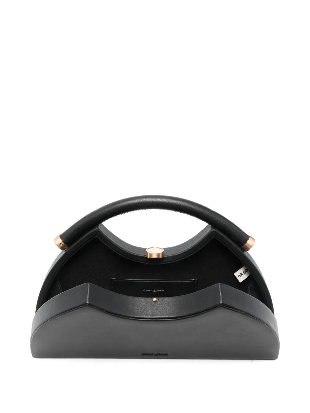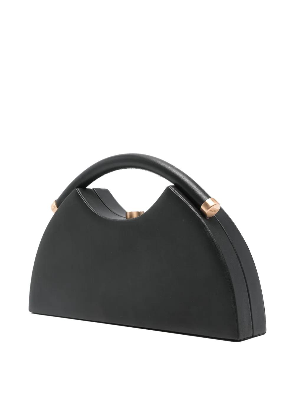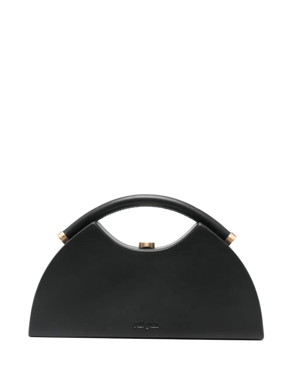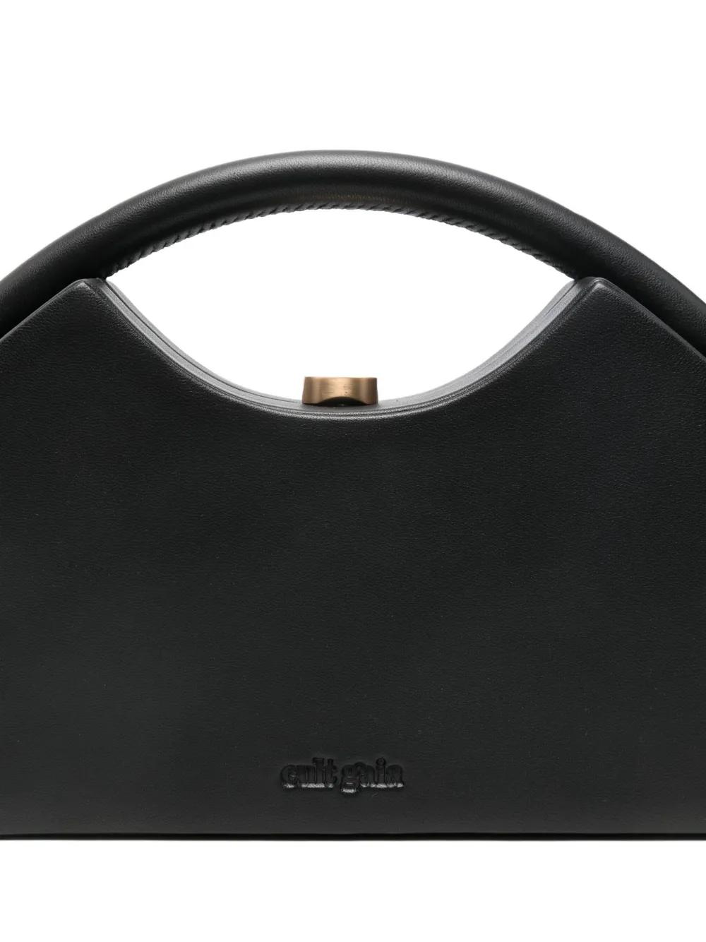 black leather top handle gold-tone hardware internal slip pocket clasp fastening