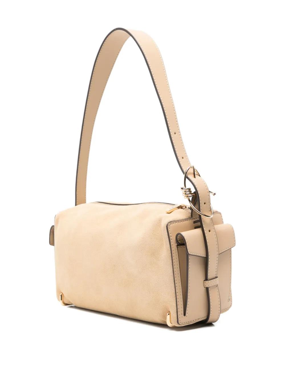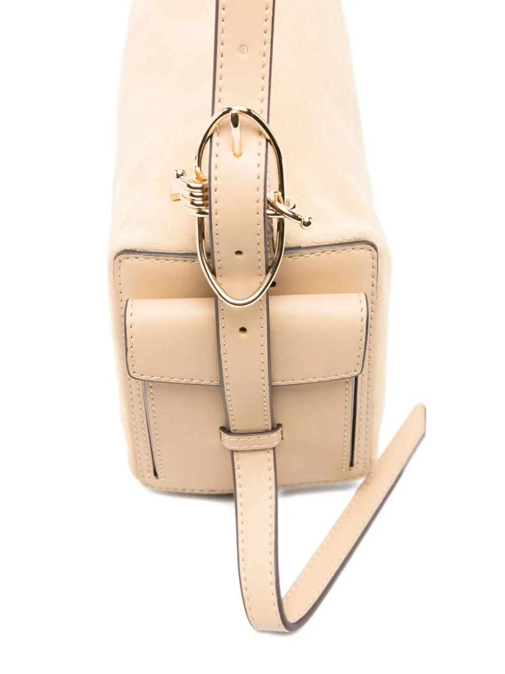 sand beige adjustable shoulder strap gold-tone hardware top zip fastening buckle detail