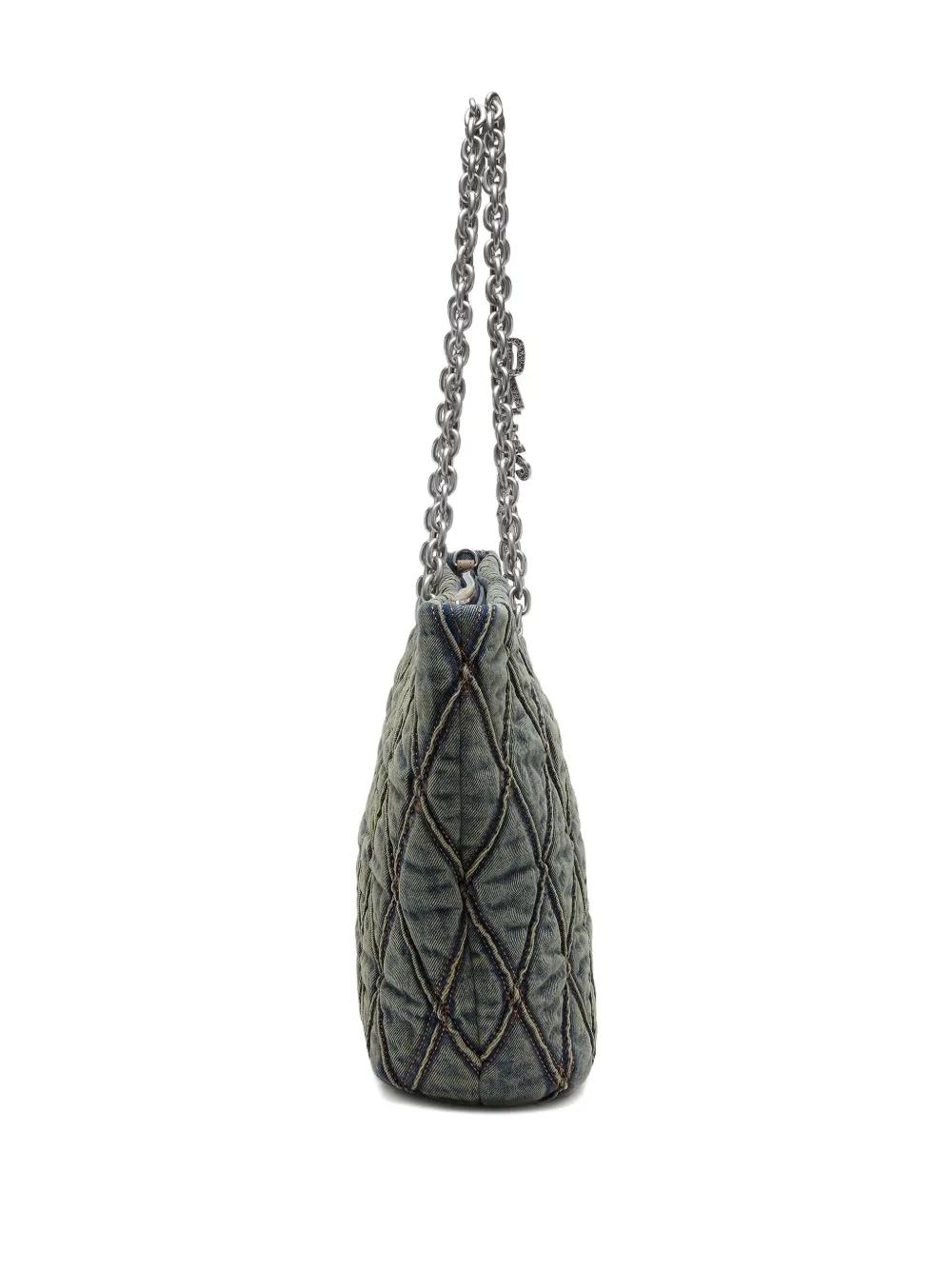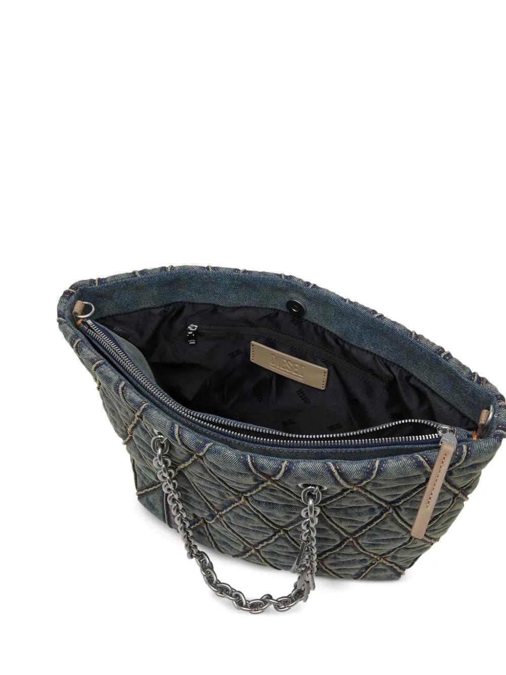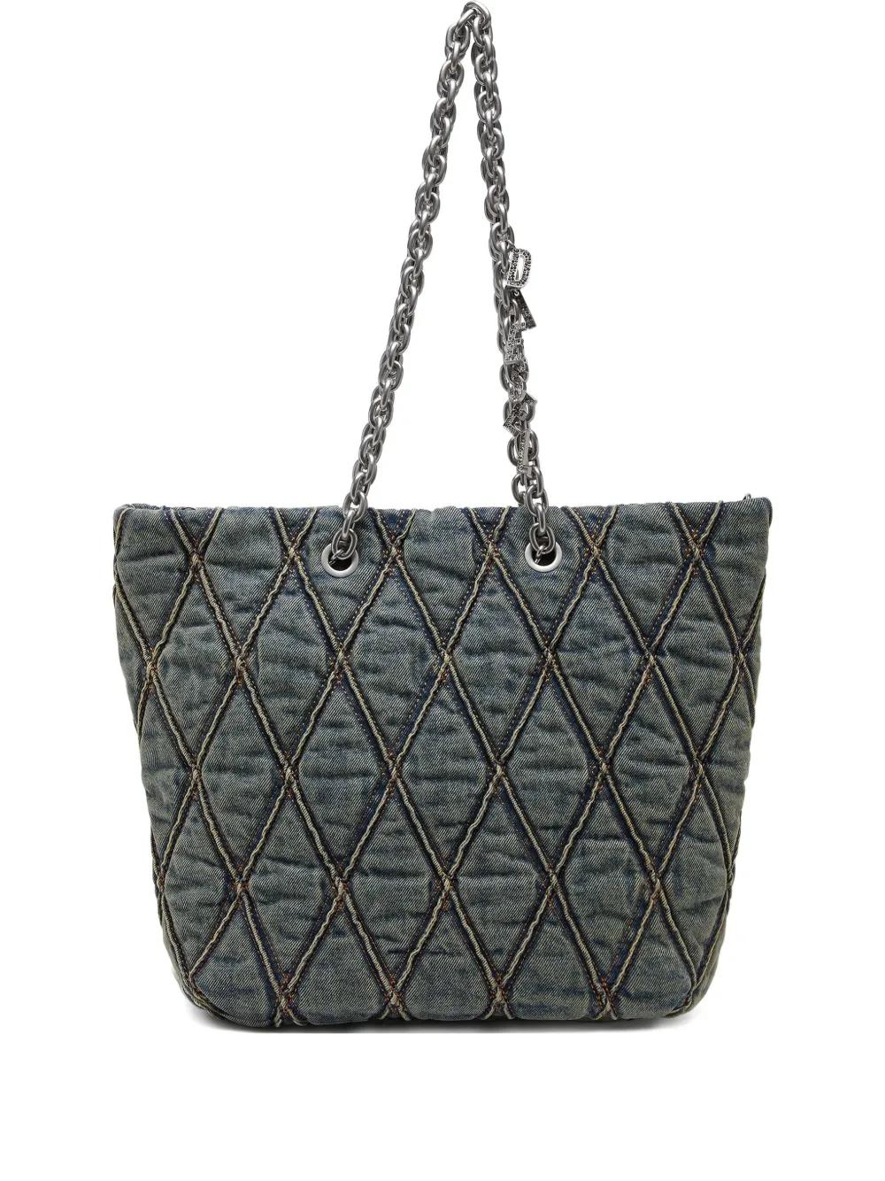 blue diamond quilting chain handles logo charms detachable strap zip fastening