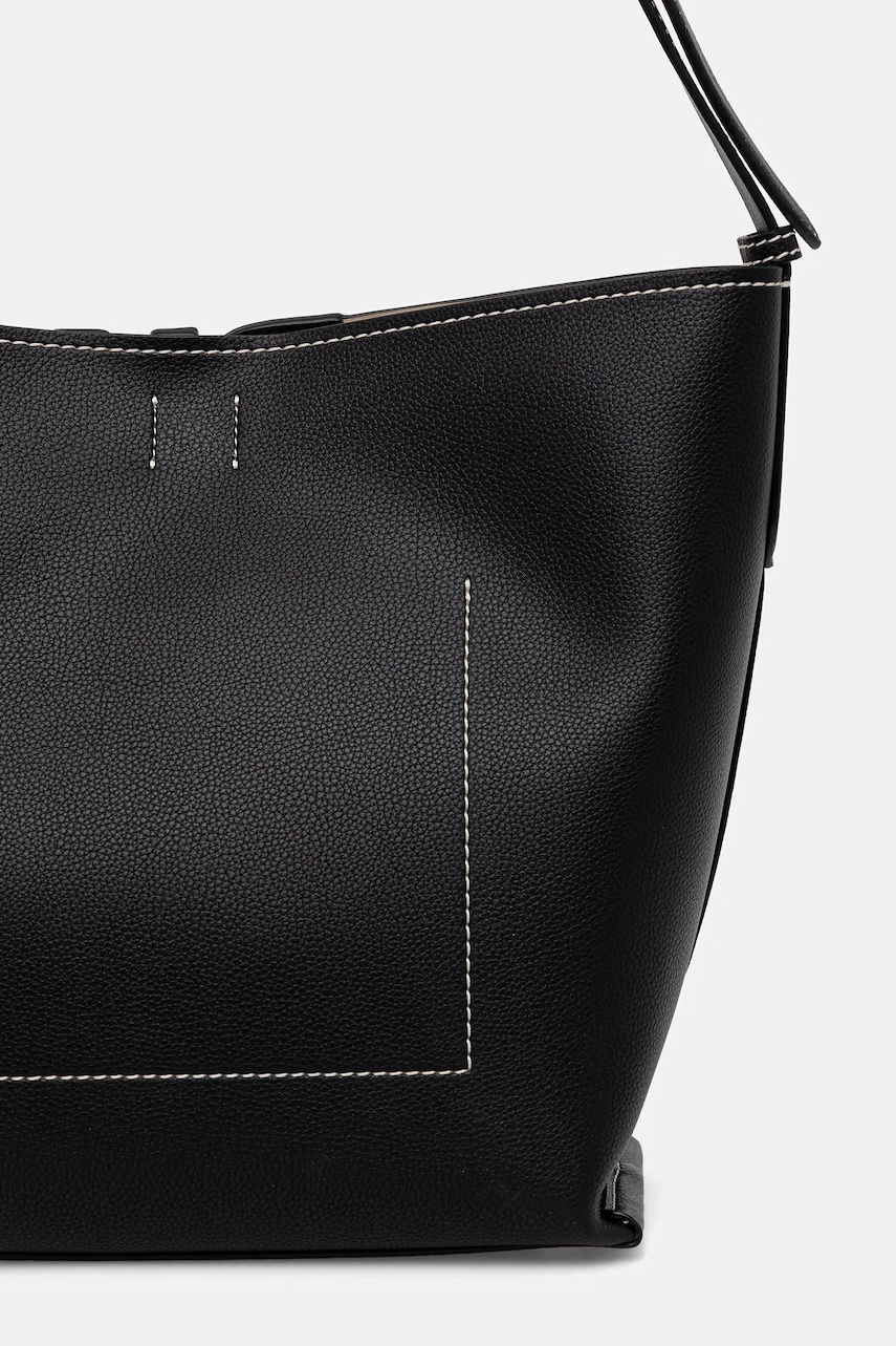 - Zapięcie na magnes. - Model bez podszewki. - Wewnętrzna, wsuwana kieszeń, która ułatwia bezpieczne przechowywanie telefonu lub innych drobiazgów. - Wypinana komora z podszewką, zapinana na suwak. - Nieodpinany pasek z regulacją. - Model wyposażony w nóżki, które zabezpieczają spód torebki. - Długość minimalna paska: 58 cm. - Długość maksymalna paska: 72 cm. - Głębokość: 13 cm. - Wysokość: 29 cm. - Szerokość u podstawy: 26 cm.