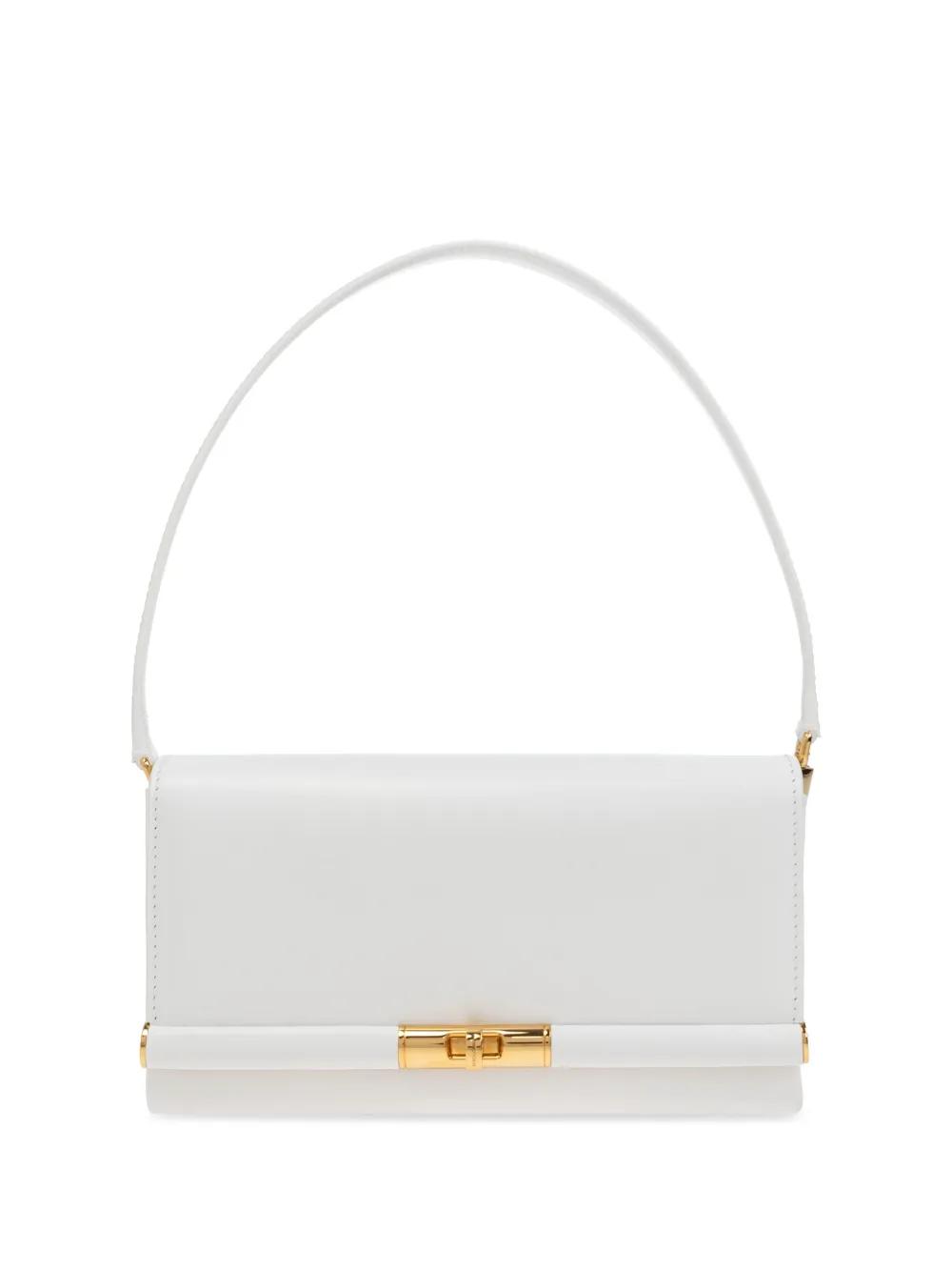 white front flap closure twist-lock fastening single top handle internal slip pocket