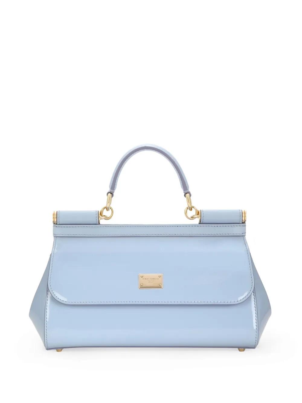 baby blue calf leather patent finish single top handle logo plaque adjustable detachable shoulder strap foldover top with magnetic fastening main compartment internal slip pocket metal feet gold-tone hardware This piece comes complete with a protective dust bag.