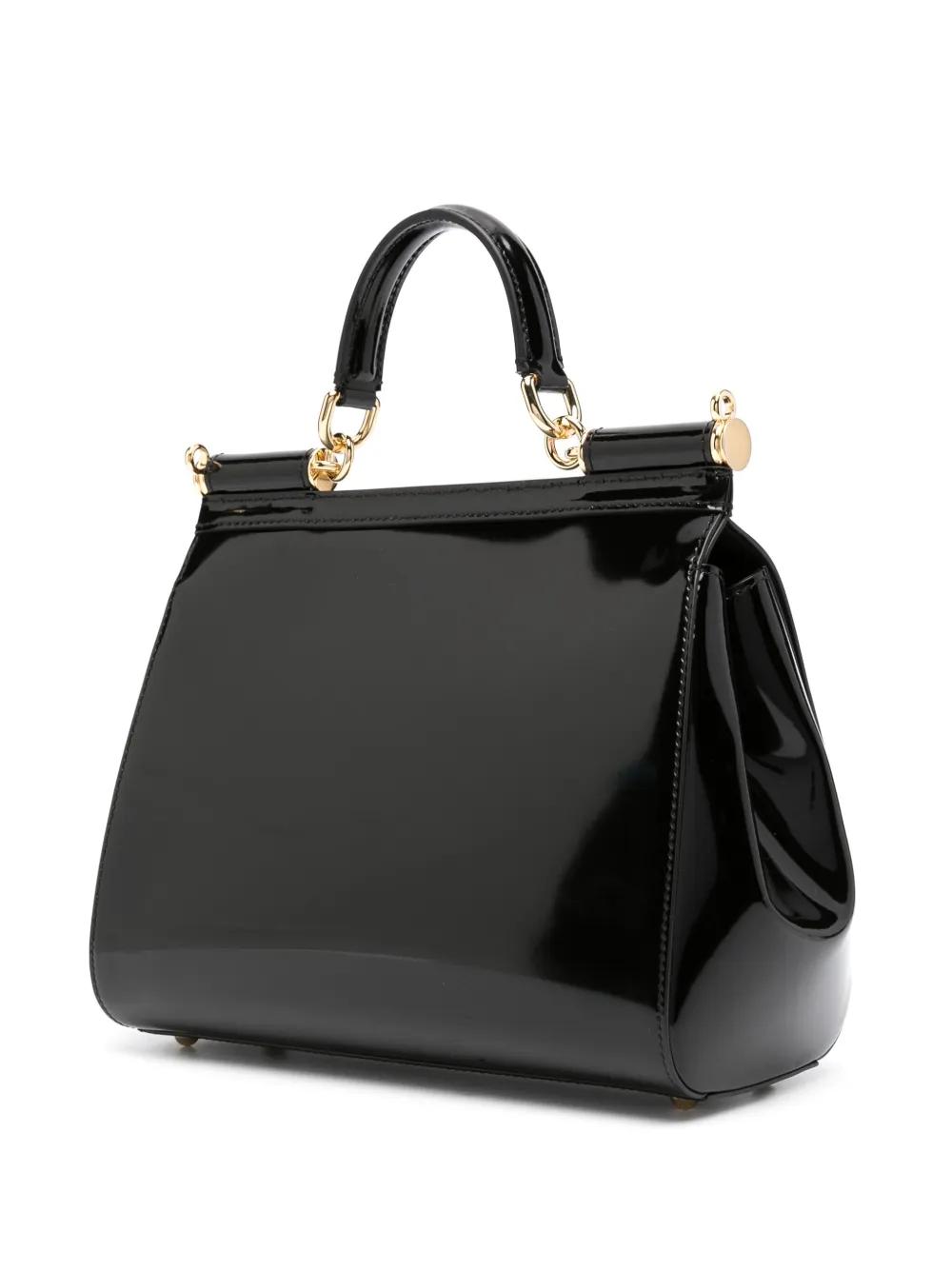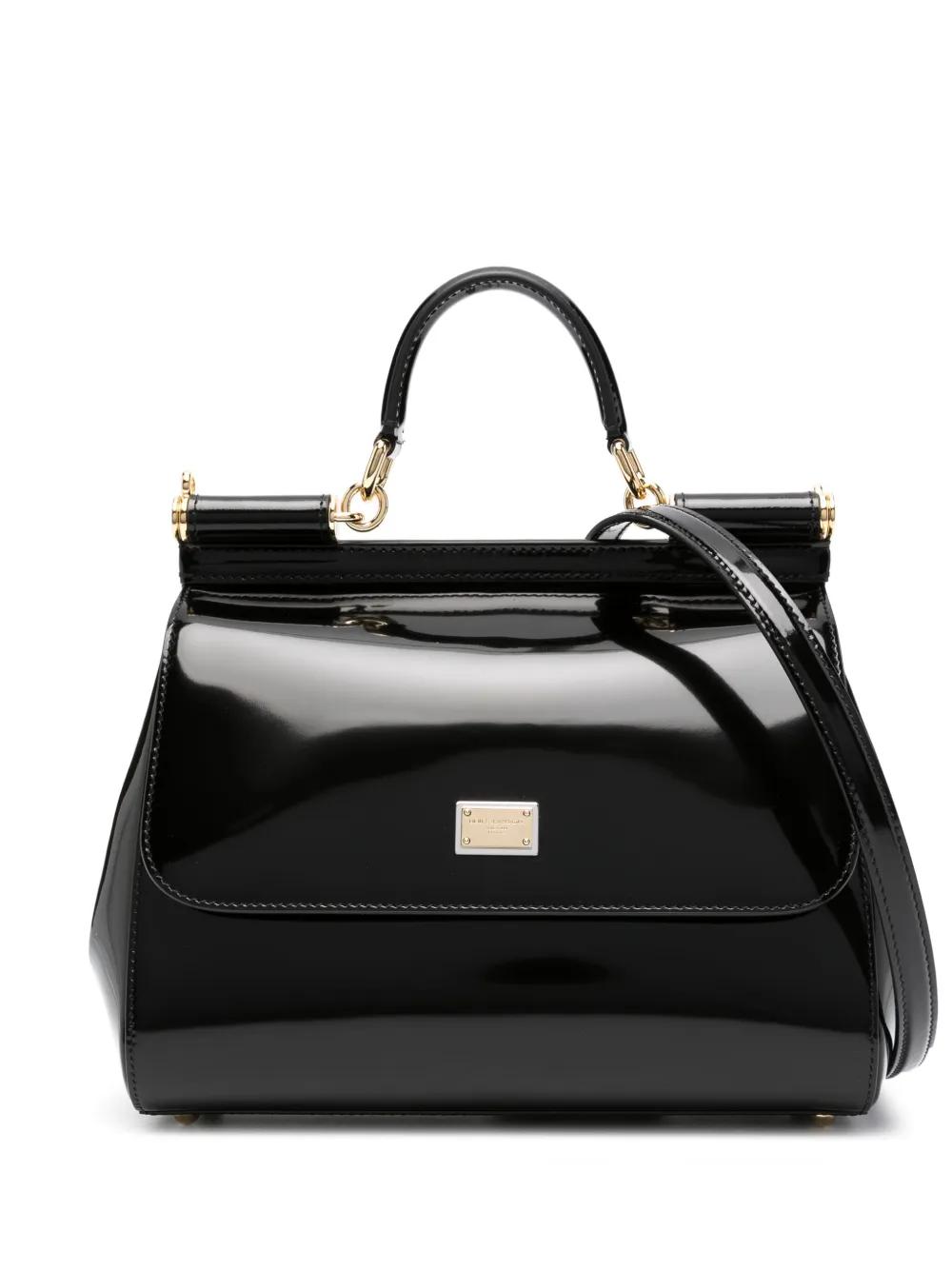 black calf leather patent finish foldover top with magnetic fastening gold-tone logo plaque gold-tone hardware metal feet single rolled top handle adjustable detachable shoulder strap leopard print lining main compartment internal card slots
