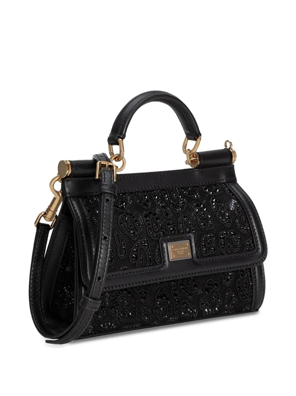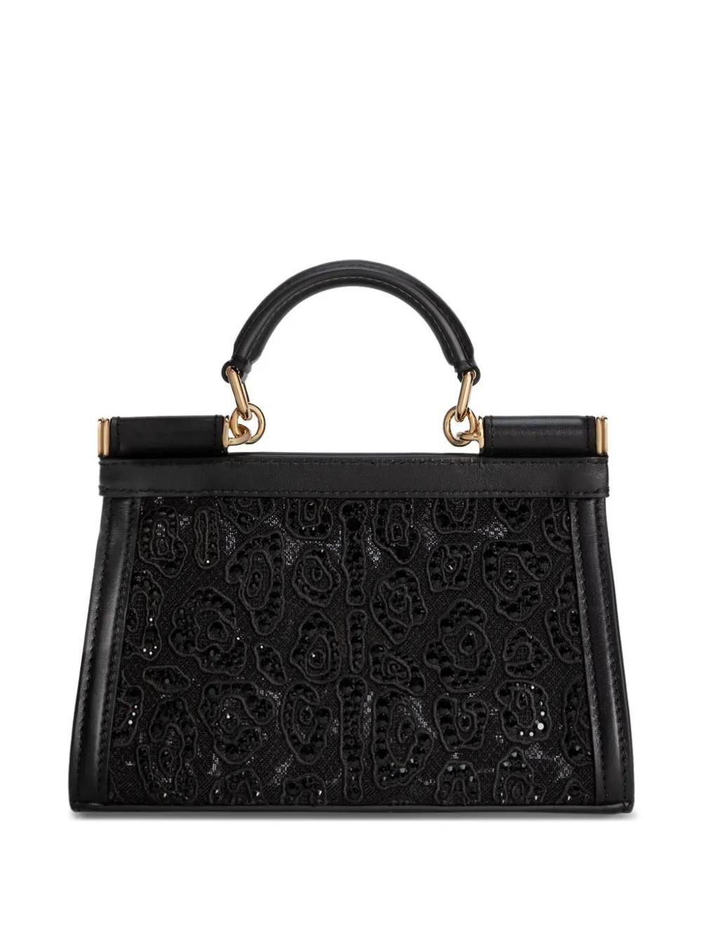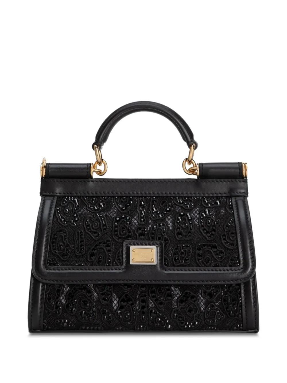 black foldover top with magnetic fastening single rolled top handle adjustable detachable shoulder strap semi-sheer construction