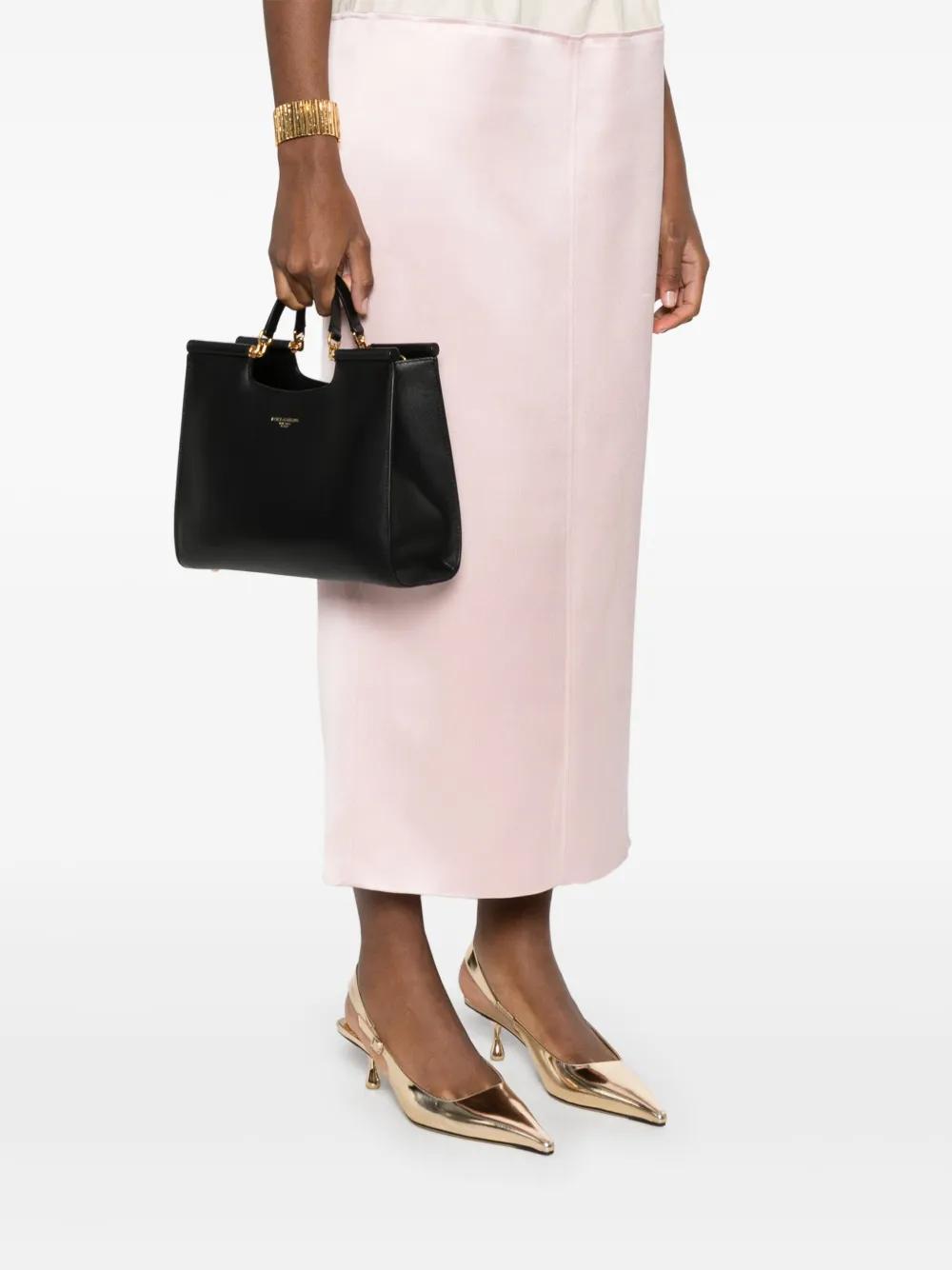 black open top two flat top handles adjustable detachable shoulder strap This piece comes complete with a protective dust bag.