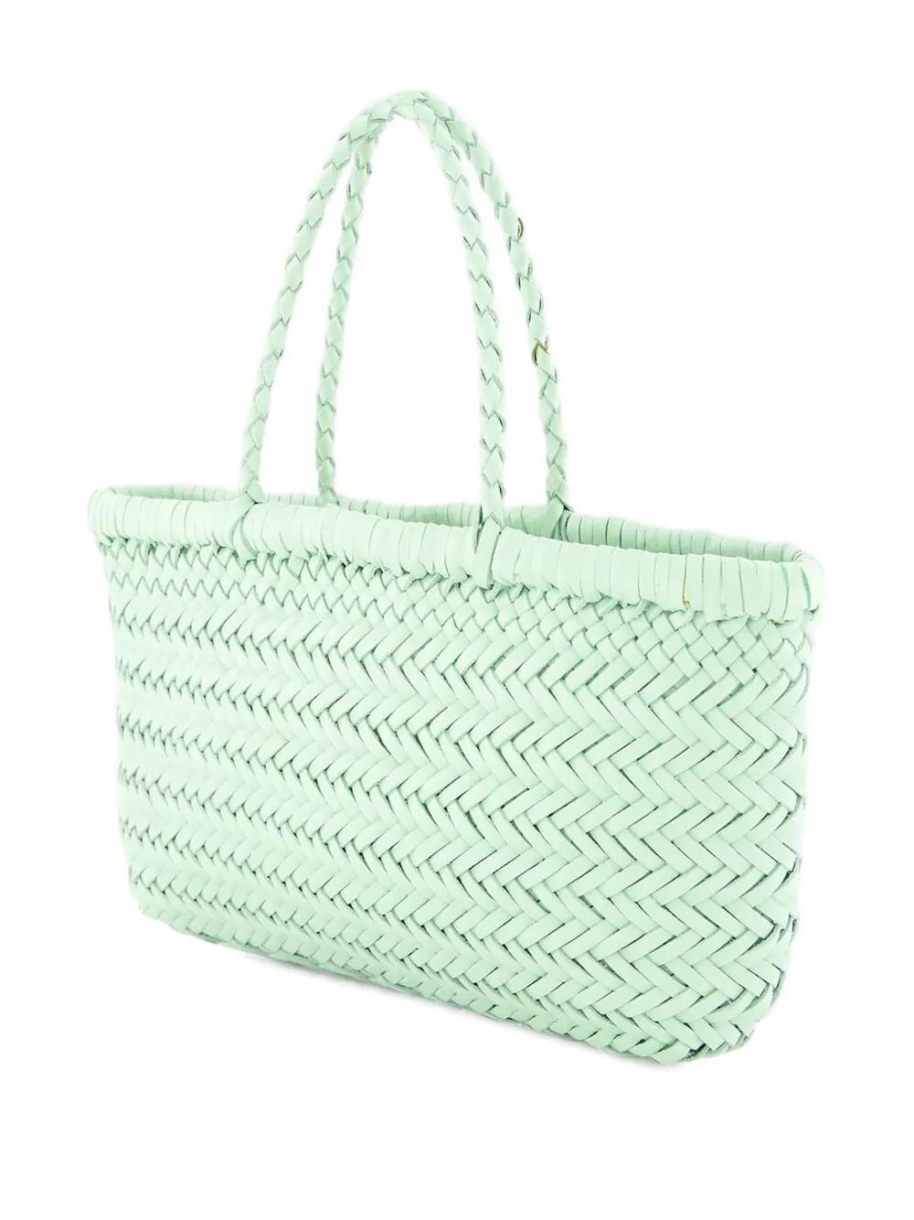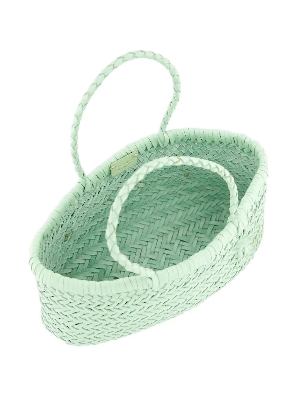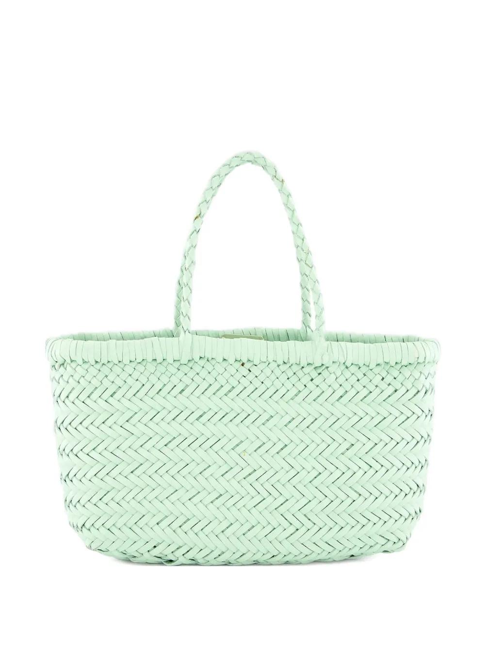 light green herringbone weave braided top handles flat base rectangular shape leather construction Please refer to the Size & Fit tab to learn more about this item's dimensions.
