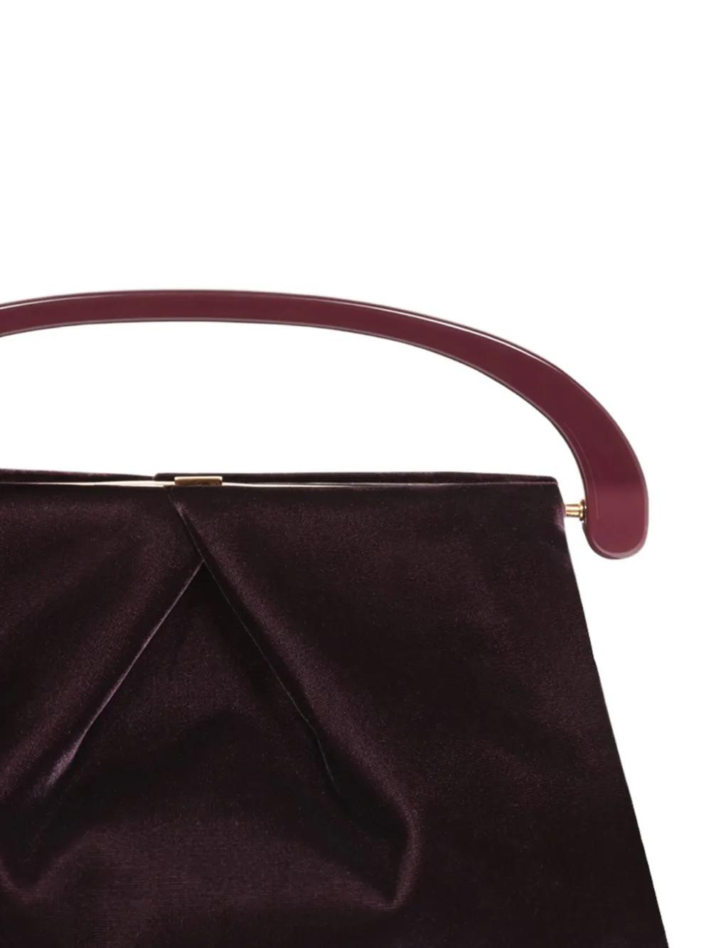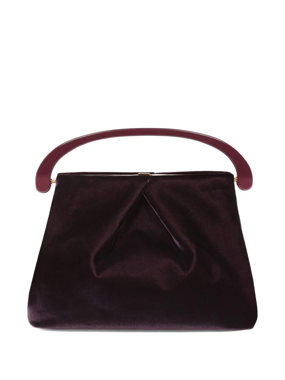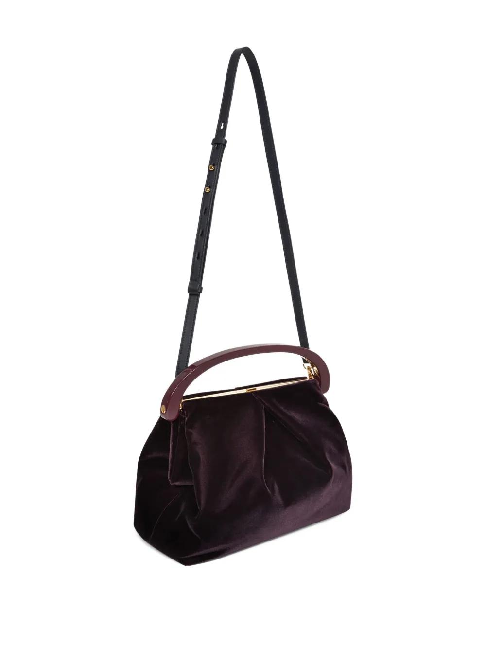 dark purple pleated velvet wooden top handle gold-tone clasp rectangular shape shoulder strap