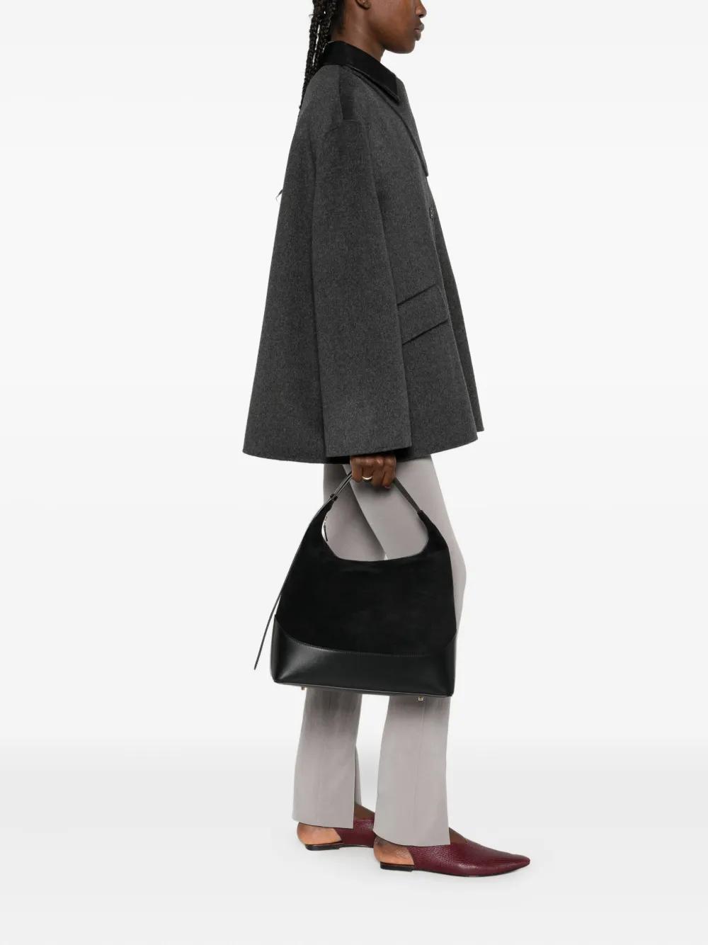 black suede leather leather panel single top handle top zip fastening adjustable strap