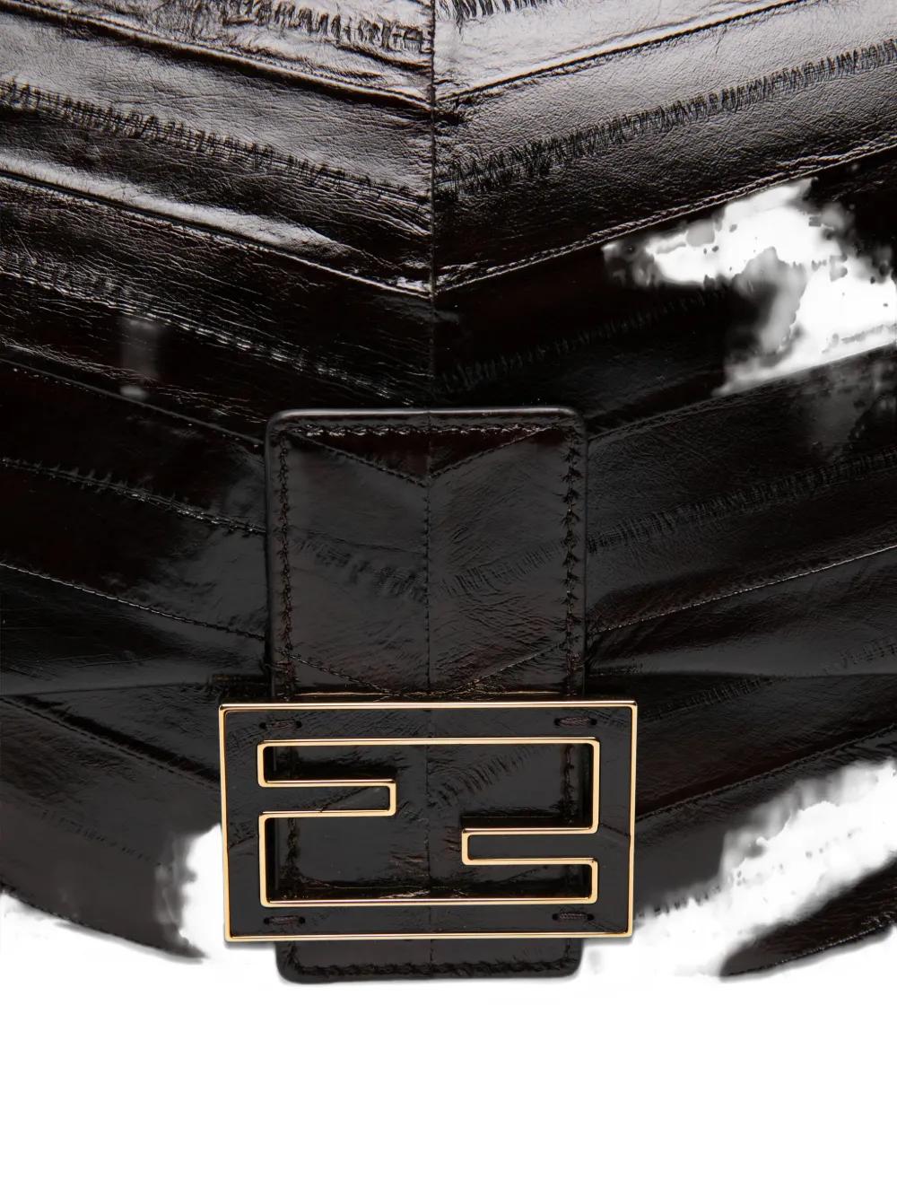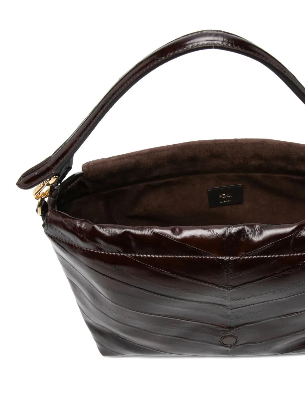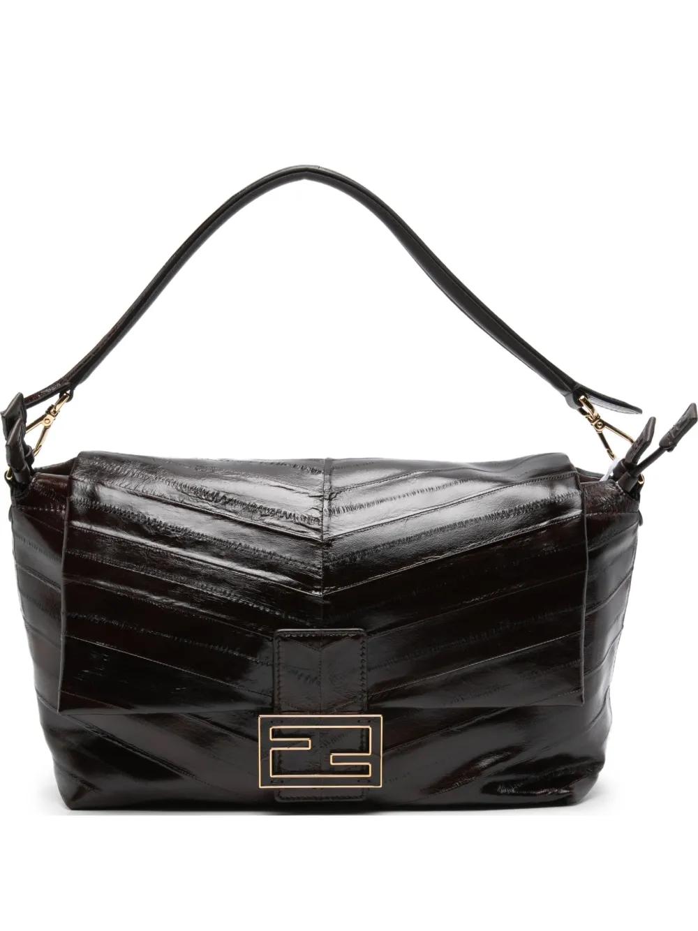 dark brown chevron design gold-tone hardware top handle logo plaque foldover top
