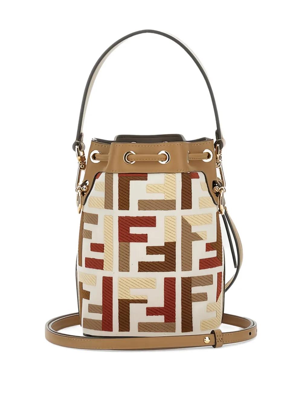 brown multicoloured FF logo embroidery drawstring closure top handle detachable shoulder strap
