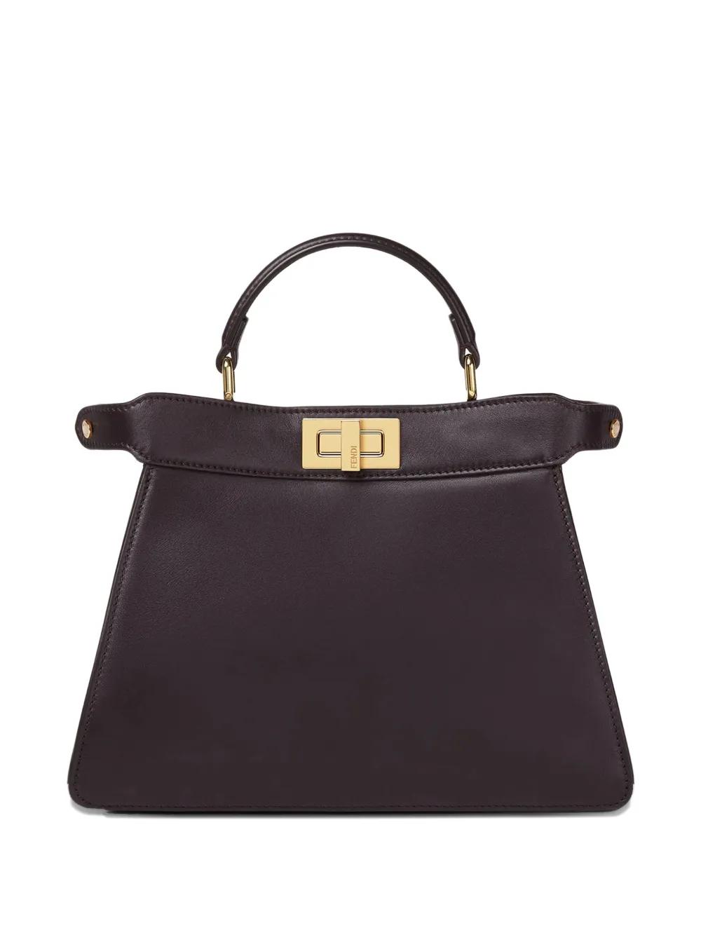 dark brown top handle detachable shoulder strap gold-tone hardware internal slip pocket twist-lock fastening