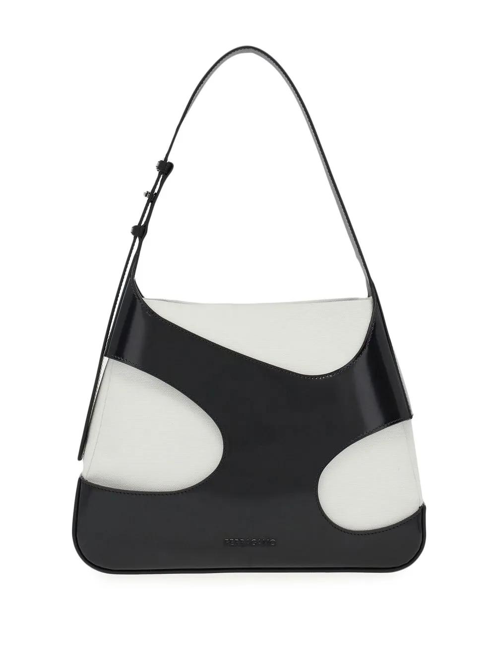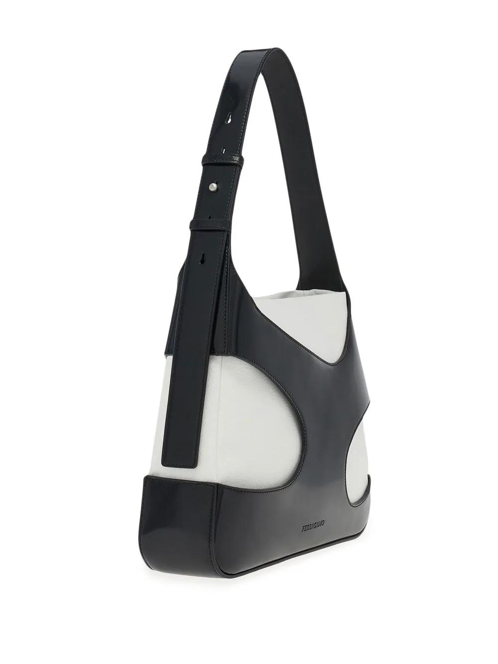 black/white calf leather cut-out detailing embossed logo to the rear single flat top handle main compartment