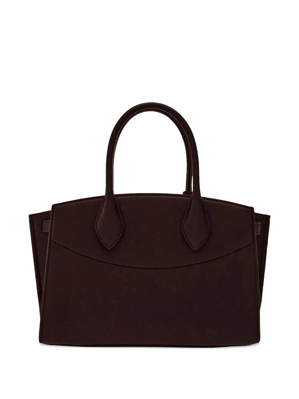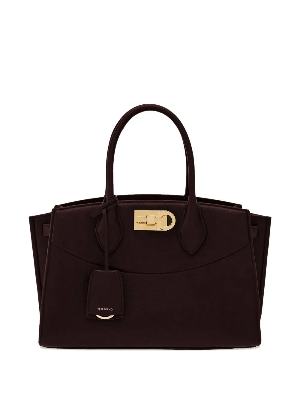 dark brown grained leather Gancini slider buckle closure two top handles adjustable removable shoulder strap hanging keyfob