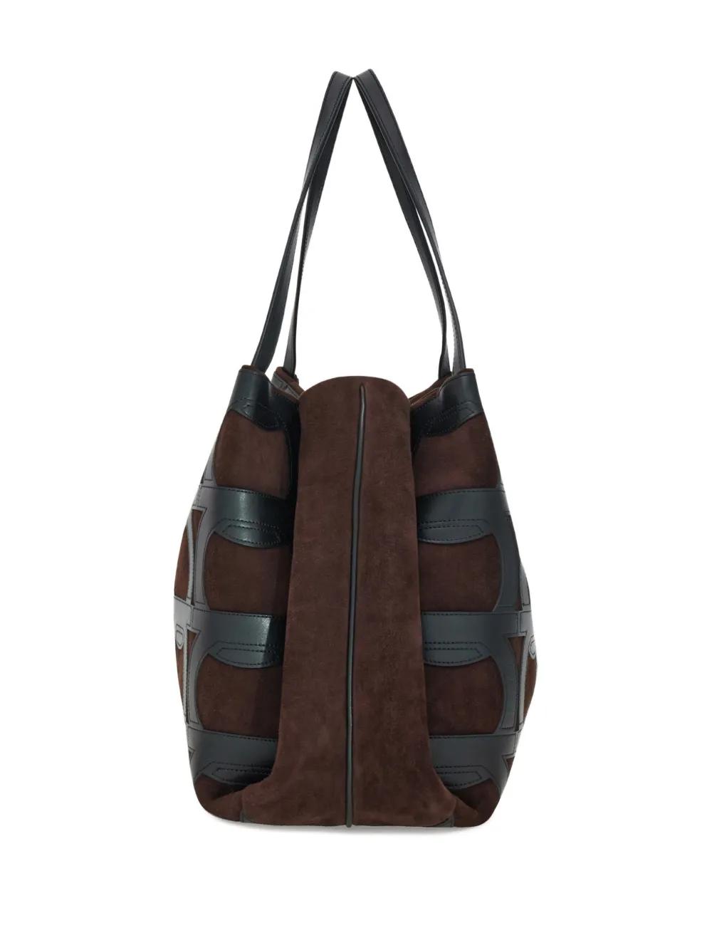 dark brown suede texture leather Gancini overlays Gancini buckle double compartment zip pocket