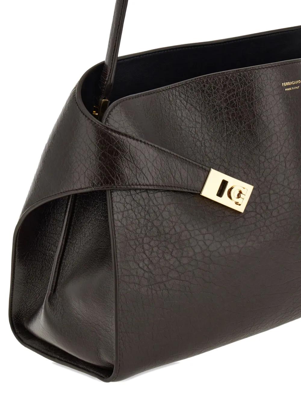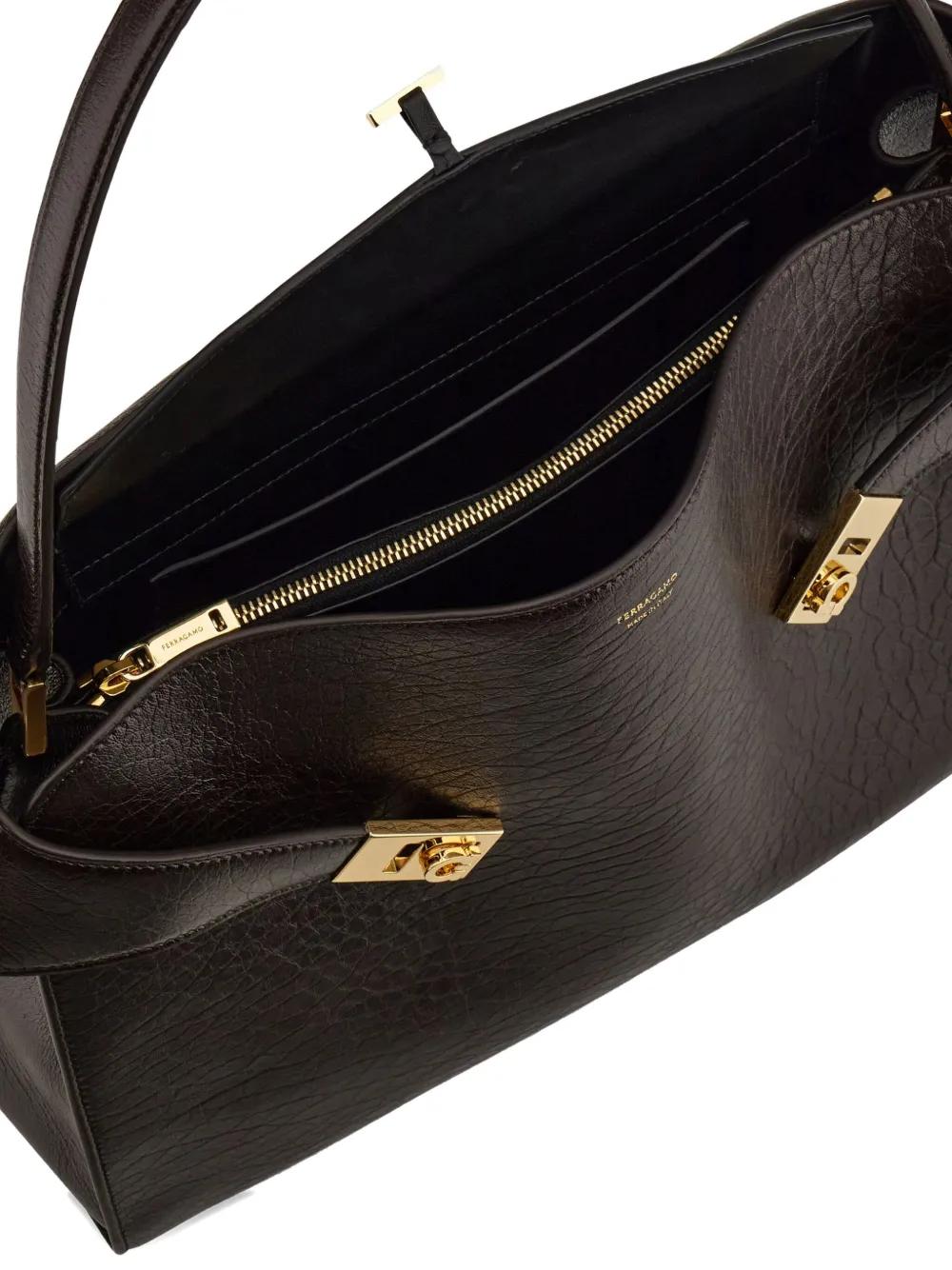 dark brown textured calfskin leather gold-tone clasp closure top handle removable shoulder strap structured silhouette gold-tone logo detail