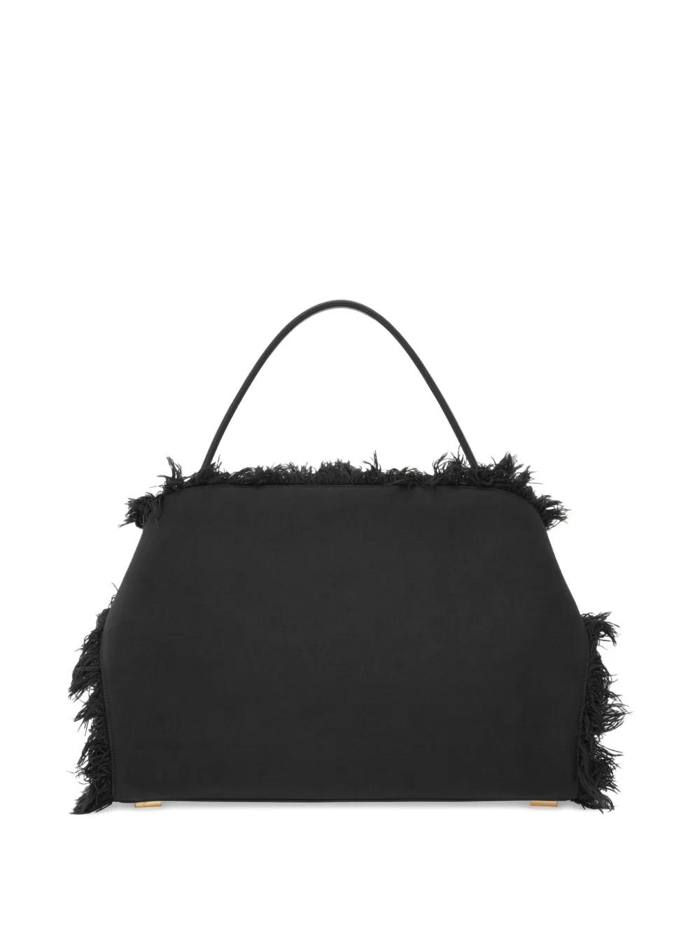 black fringe embellishment single top handle logo hardware accents spacious interior soft silhouette