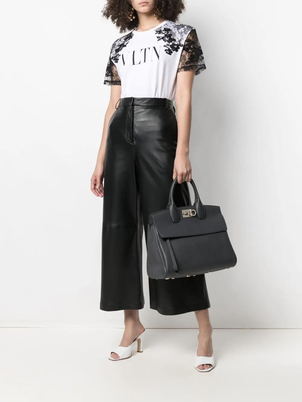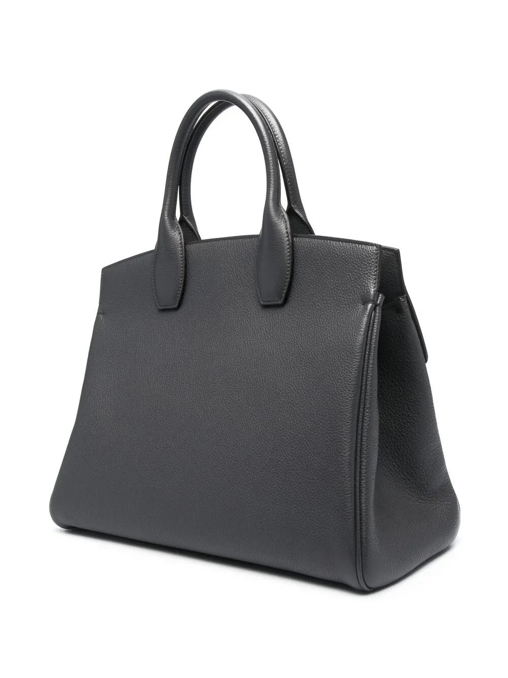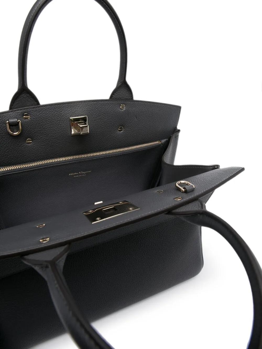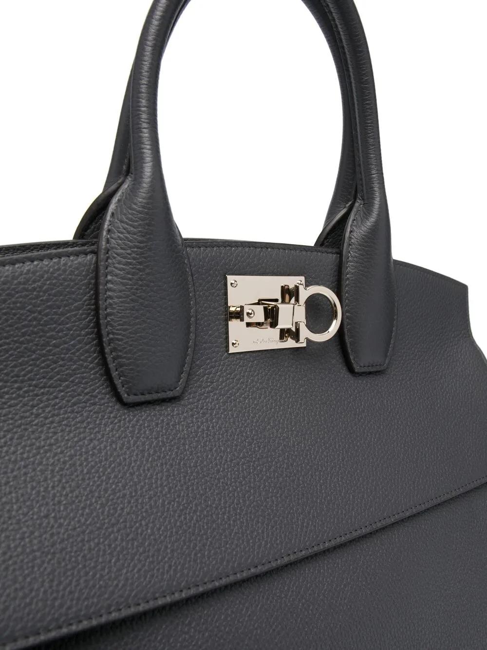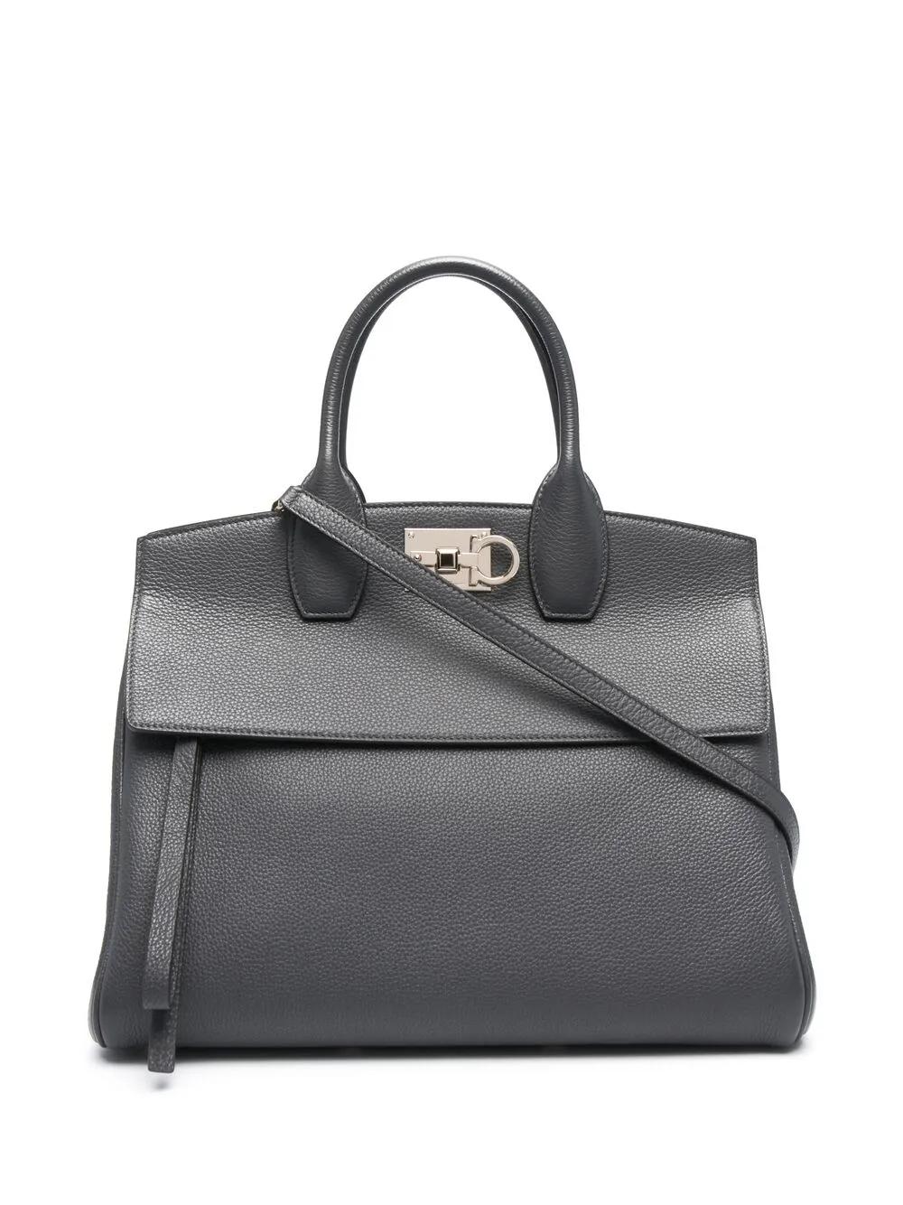 dark grey calf leather textured finish Gancini buckle two rounded top handles adjustable detachable shoulder strap clasp fastening top zip fastening internal zip pocket internal logo stamp