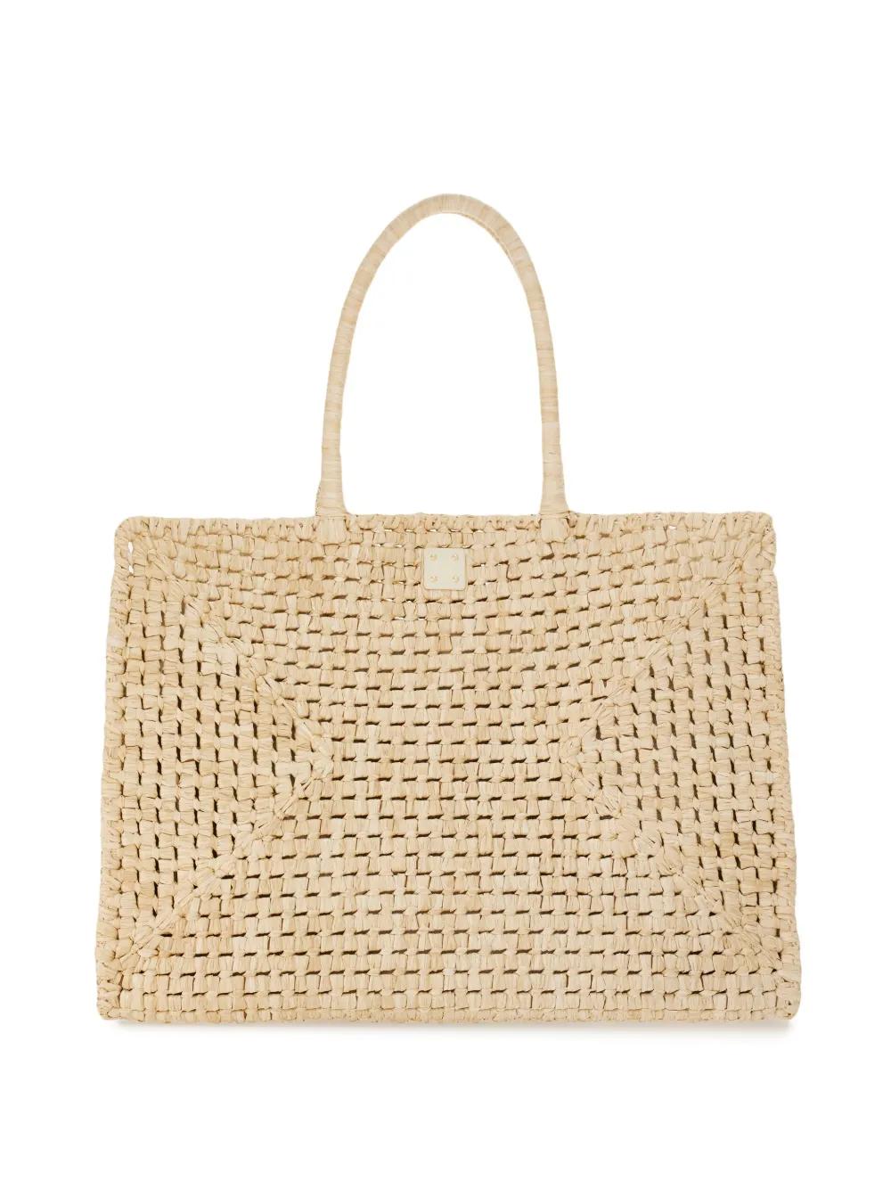 almond beige raffia interwoven design Gancini buckle internal logo patch two rolled top handles main compartment