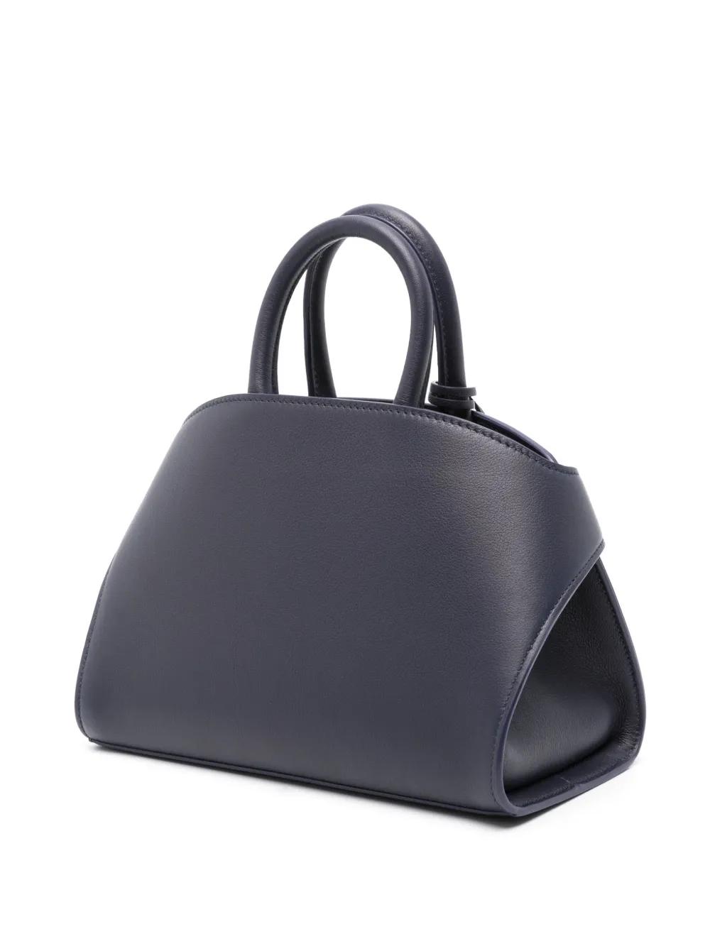 midnight blue calf leather textured finish trapeze body two rolled top handles adjustable detachable shoulder strap logo print to the front detachable keyring attachment main compartment internal card slots gold-tone hardware open top This piece comes complete with a protective dust bag.