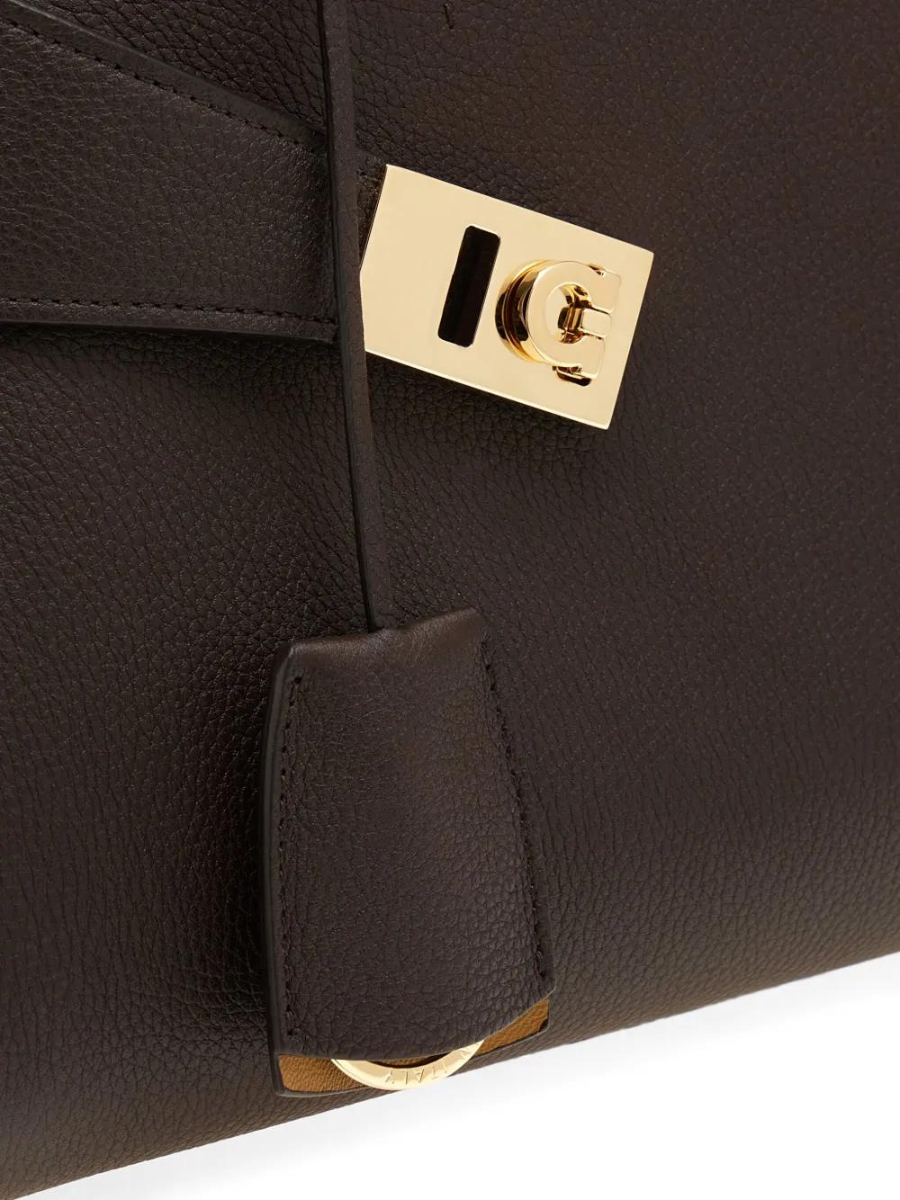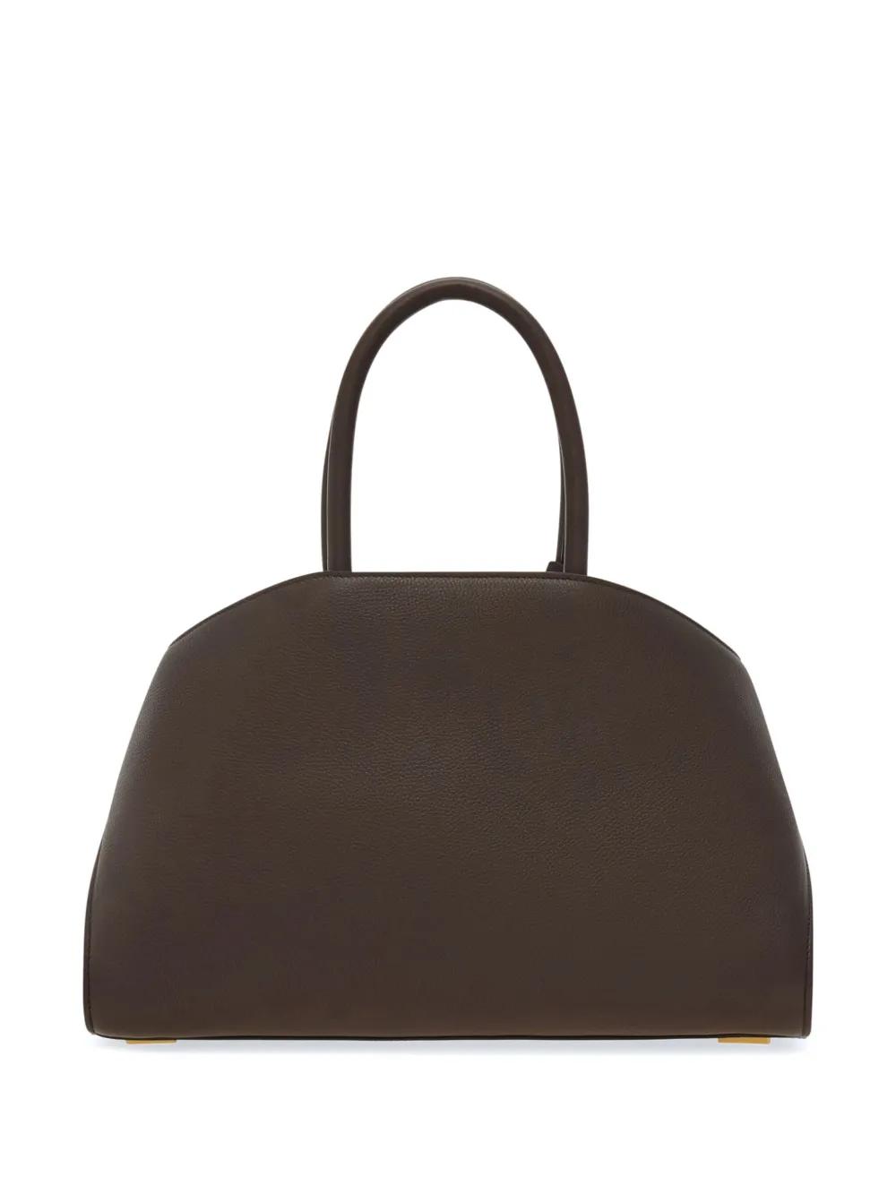 brown lambskin grained texture ring fastening asymmetric design two top handles leather tag full lining main compartment internal zip-fastening pocket