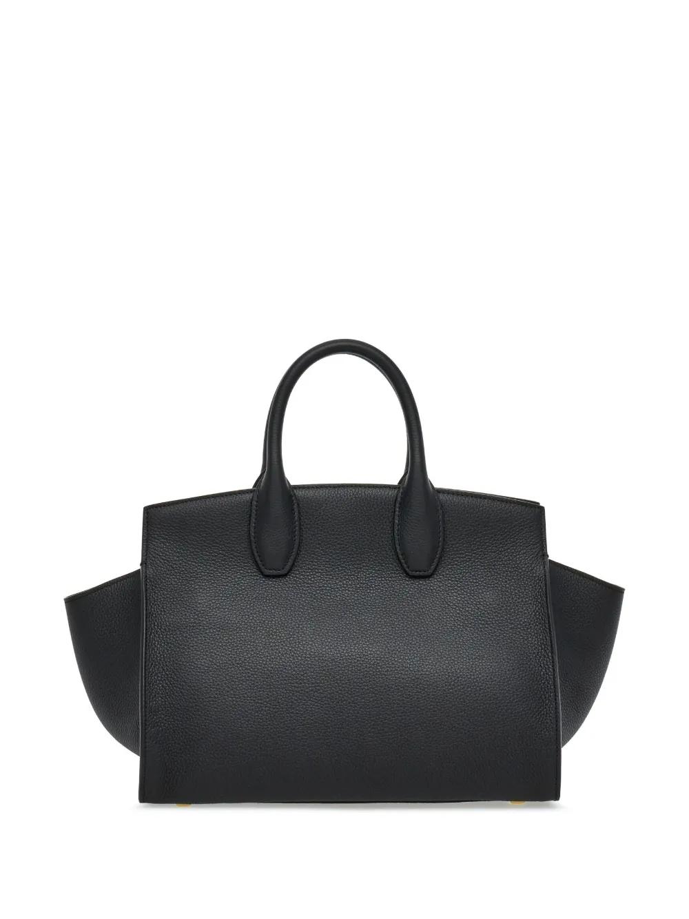 black calf leather/goatskin Gancini buckle engraved logo gold-tone hardware two rolled top handles main compartment metal feet