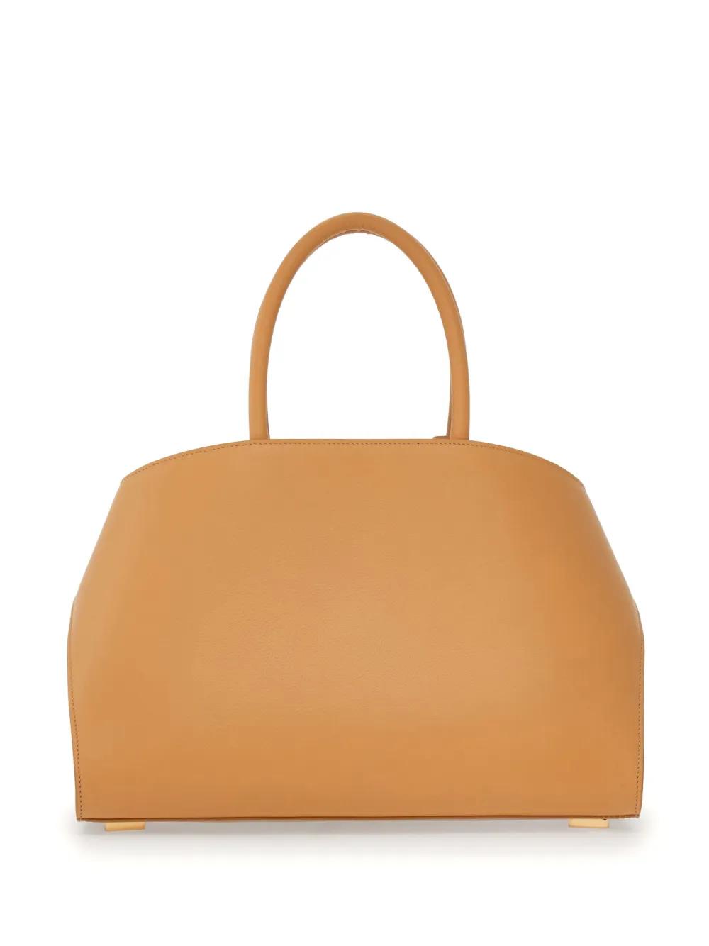 camel brown calf leather smooth grain leather tag two rolled top handles Gancini buckle main compartment internal zip-fastening pocket metal feet silver-tone hardware