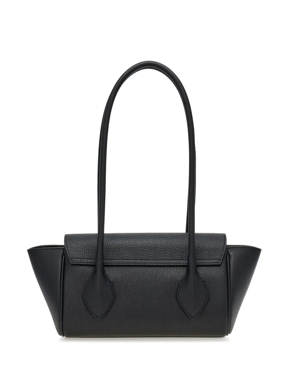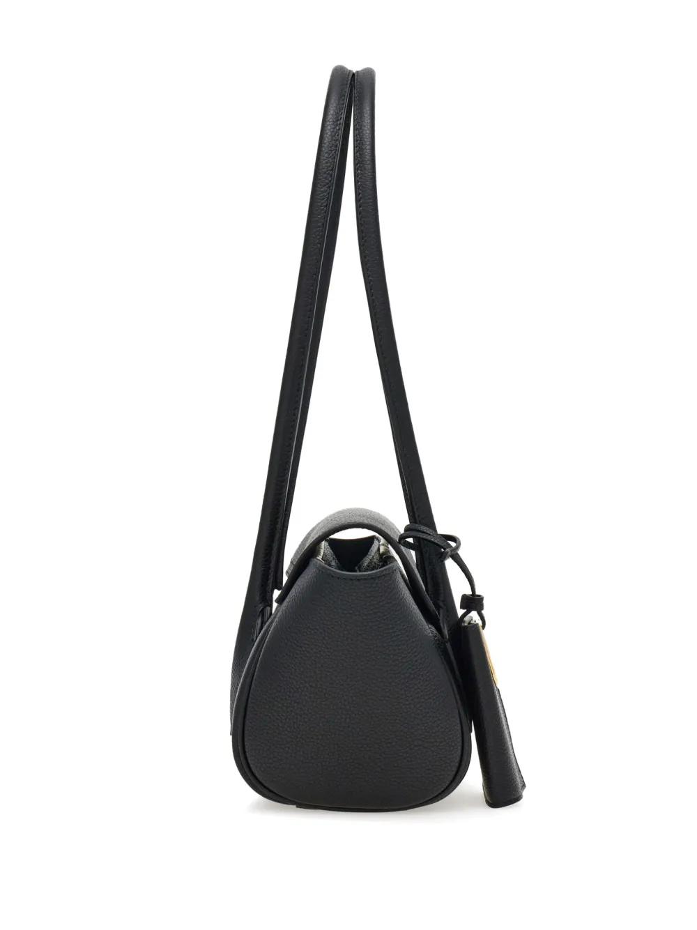 black calf leather pebbled texture two flat shoulder straps hanging key fob logo print to the front main compartment internal logo patch multiple internal slip pockets full lining gold-tone hardware front flap closure with top zip fastening