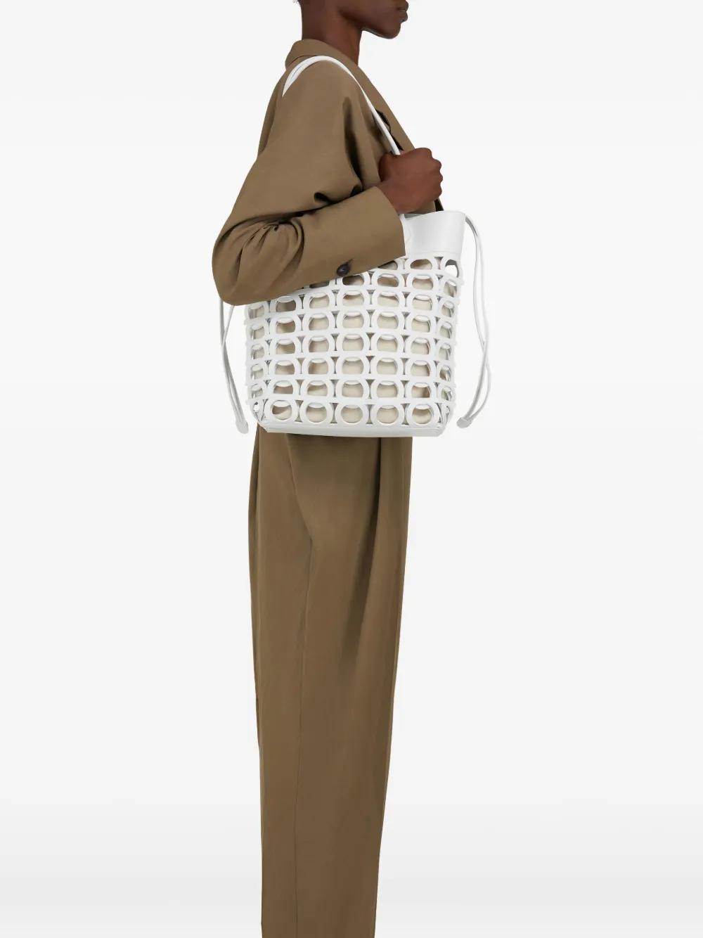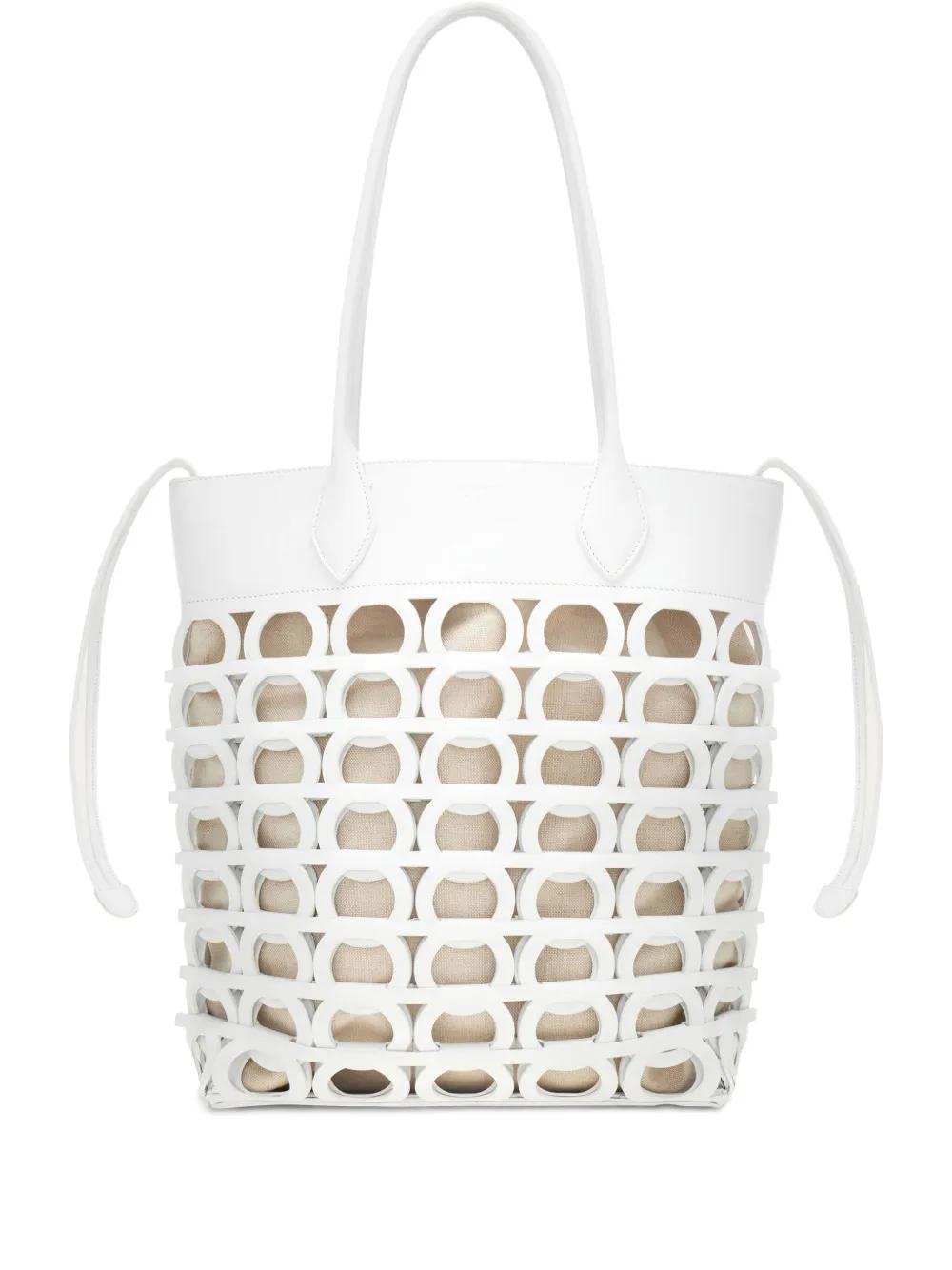 white top drawstring fastening flat top handles main compartment laser-cut detail