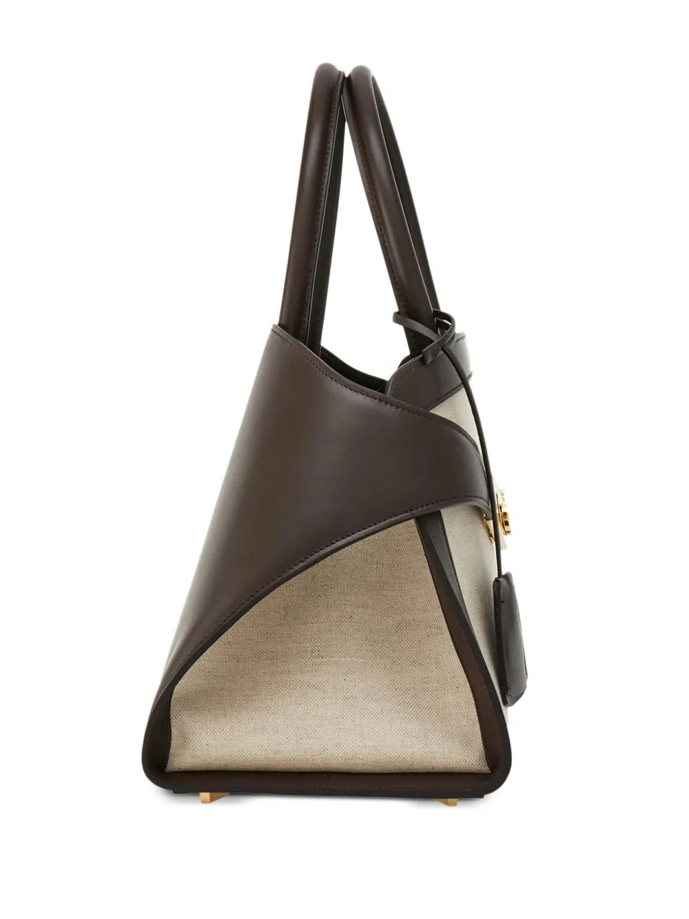 off-white/brown calf leather logo print to the front luggage tag strap detailing clasp fastening two rolled top handles detachable shoulder strap internal zip-fastening pocket