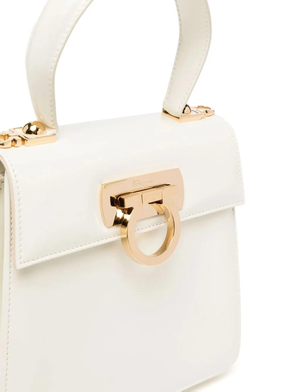 magnolia white calf leather single top handle adjustable detachable shoulder strap Gancini flip-lock fastening partitioned compartment internal zip pocket internal logo patch trapeze body metal feet