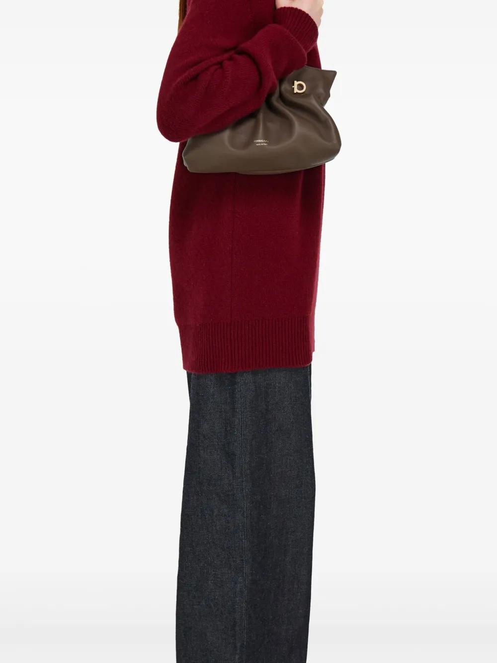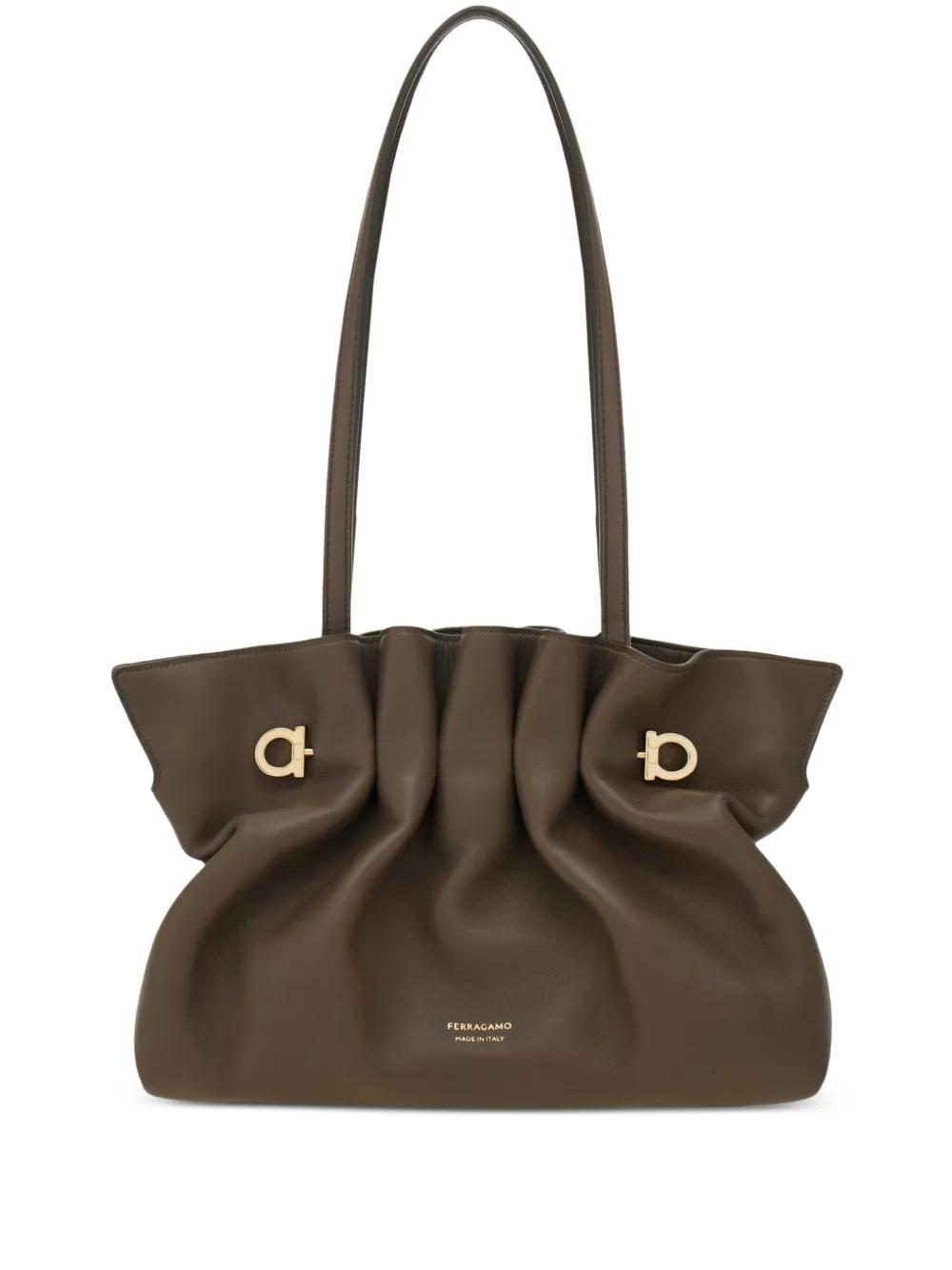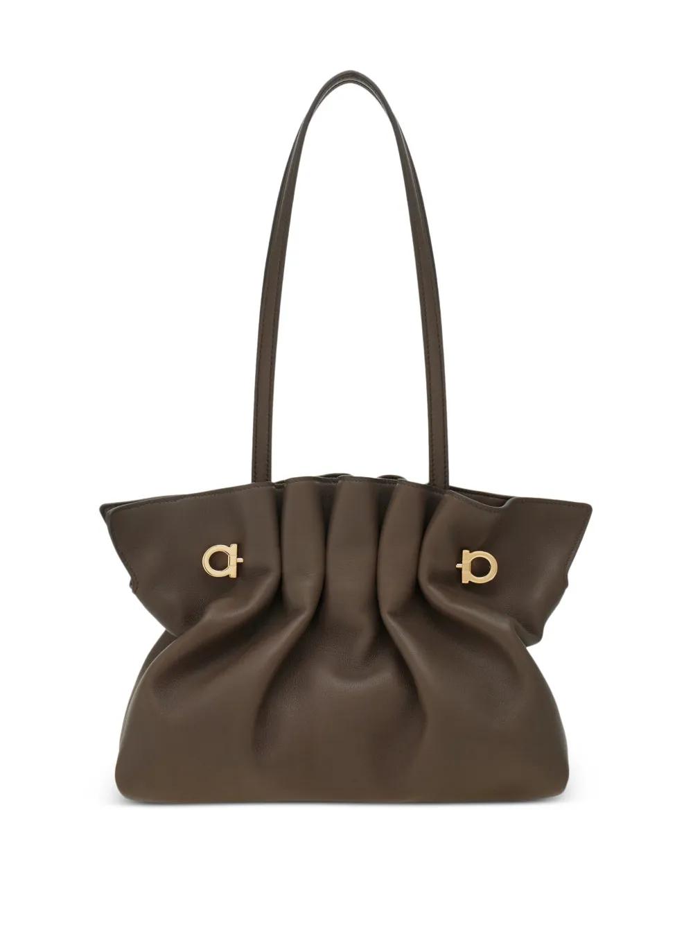 brown central ruching detail twin shoulder straps logo hardware accents spacious interior soft silhouette