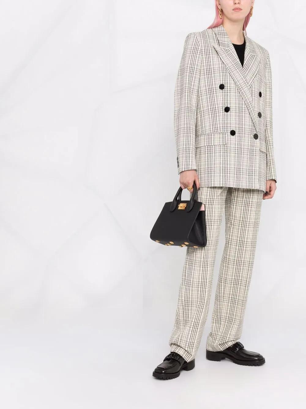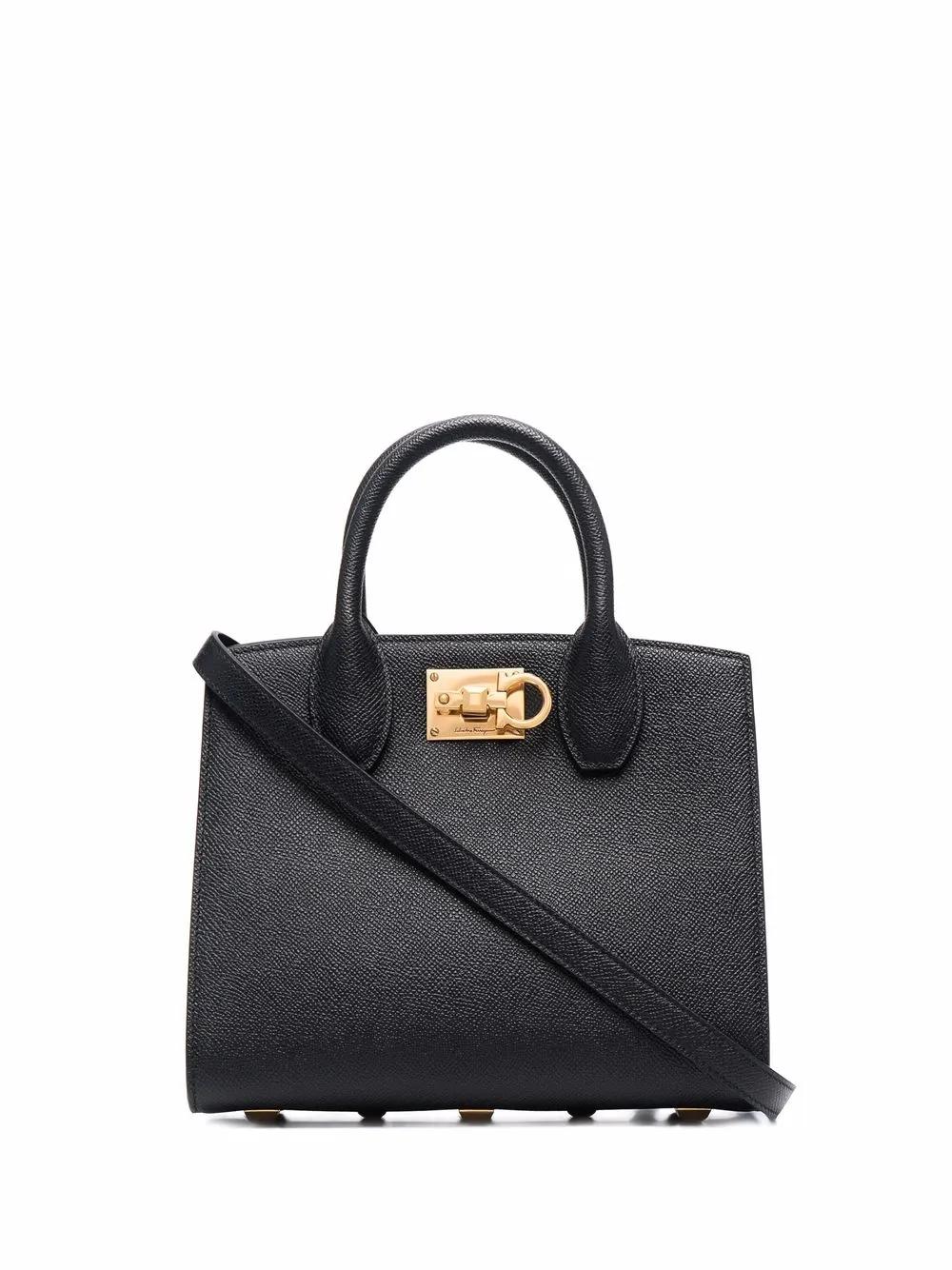 black calf leather grained texture two top handles Gancini flip-lock fastening adjustable shoulder strap internal card slots metal feet