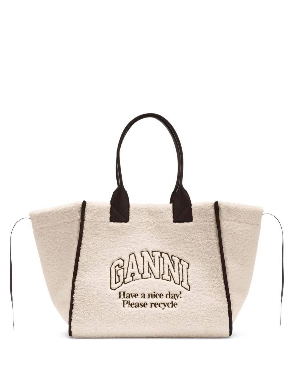 caramel brown/milk white cotton blend leather trim interwoven design embroidered logo to the front concealed magnetic fastening two long top handles main compartment internal zip-fastening pocket internal logo patch