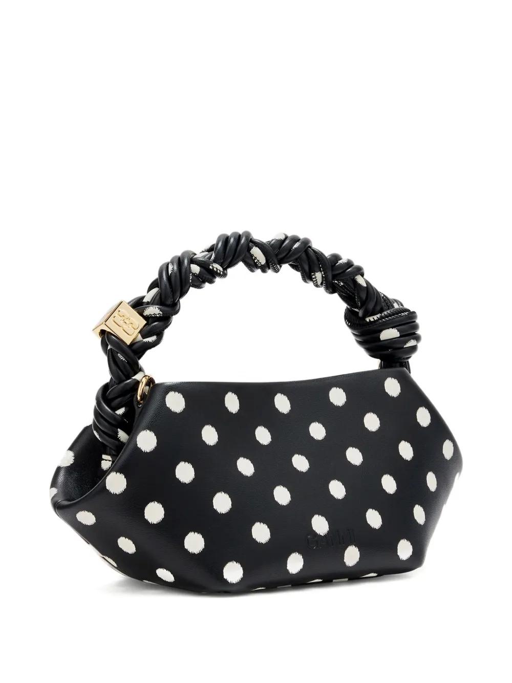 black polka dot pattern twisted top handle detachable shoulder strap gold-tone hardware logo detail