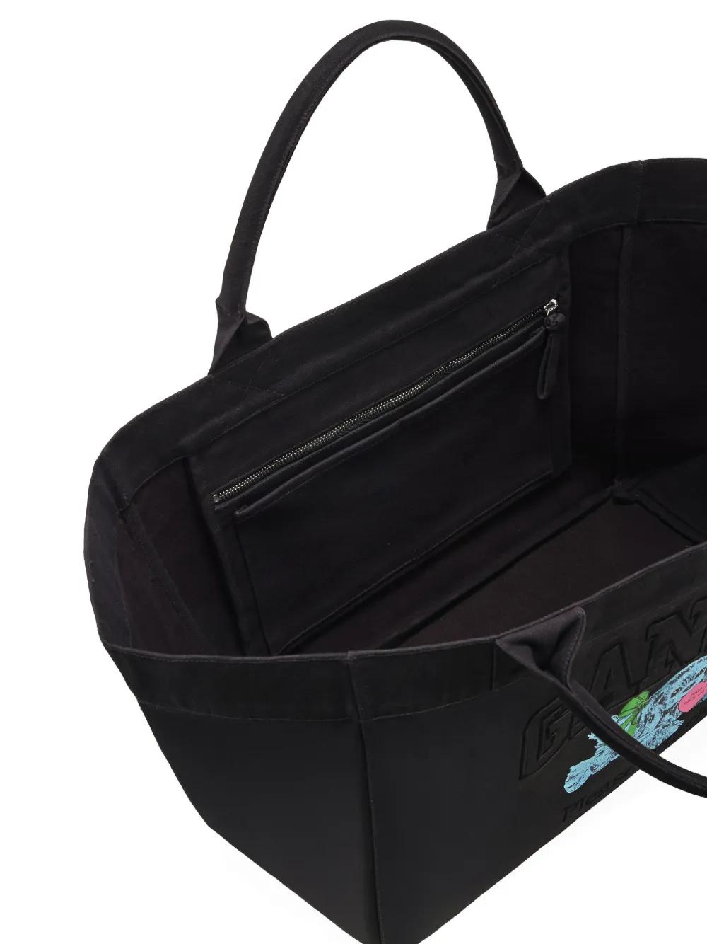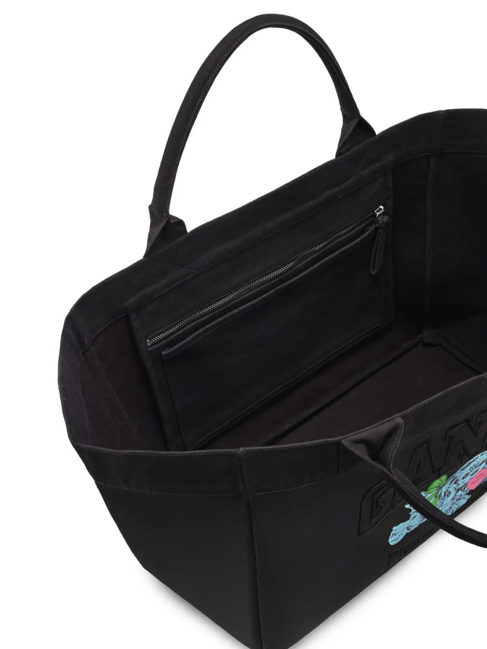 black embossed logo dog graphic top handles internal zip pocket wide shape open compartment