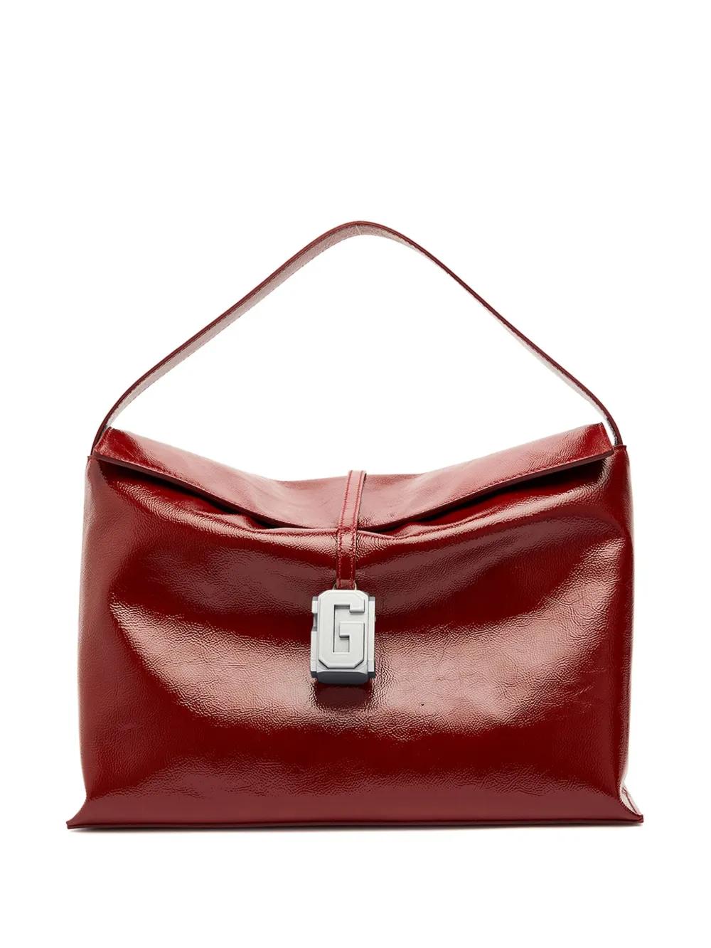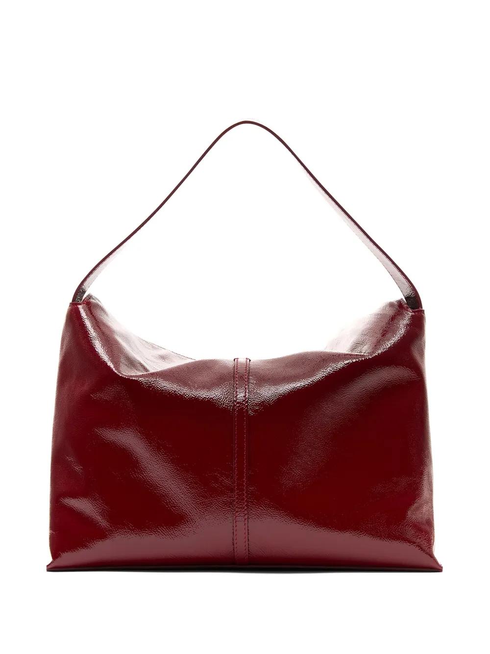 bordeaux red leather patent finish single top handle main compartment logo plaque