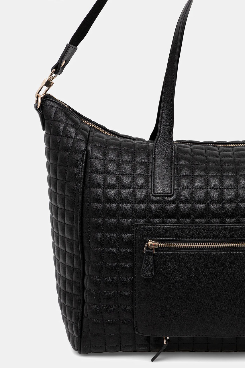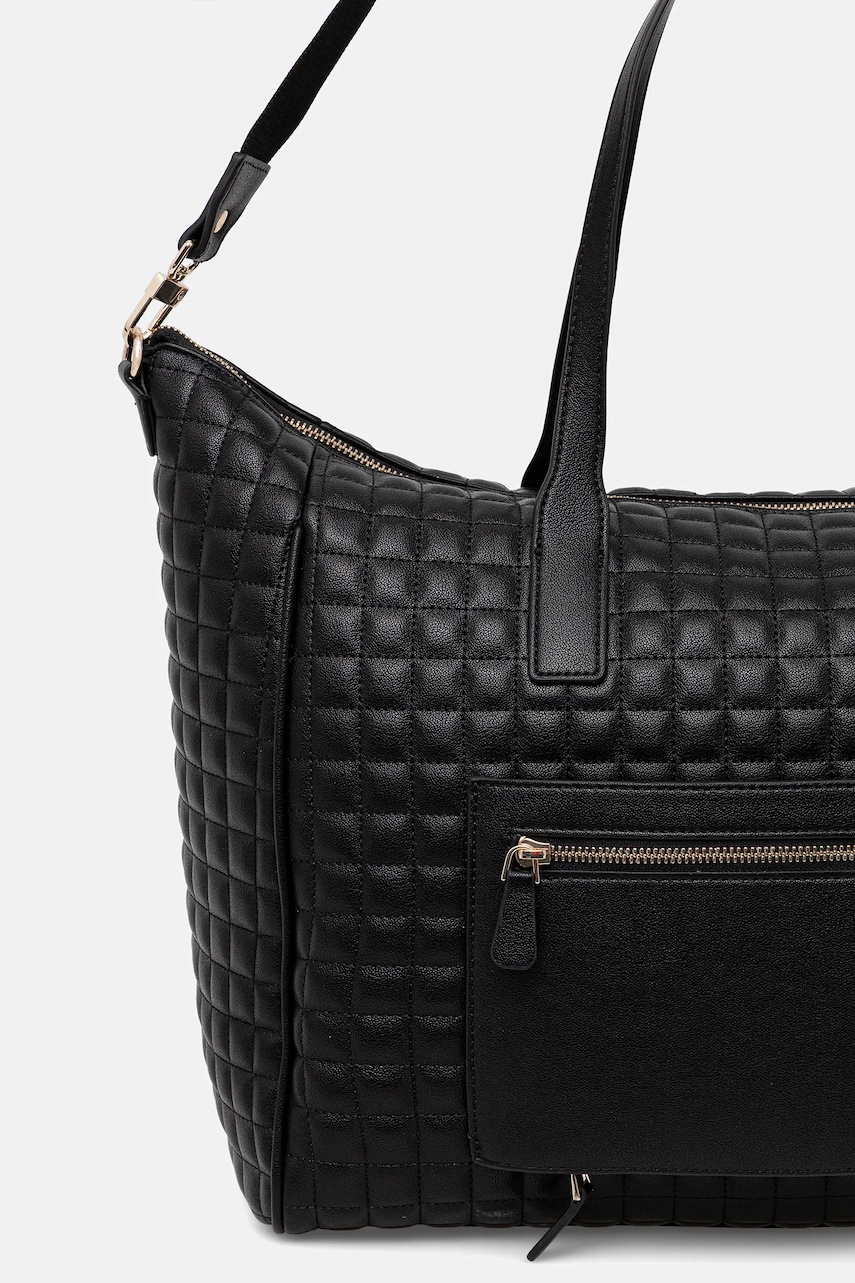 - Komora zapinana na suwak. - Mieści format A4. - Kieszonka wewnętrzna zapinana na suwak. - Posiada uchwyty i odpinany pasek bez regulacji. - Model z podszewką. - Dwie wsuwane kieszonki zewnętrzne. - Model wyposażony w metalowe nóżki, które zabezpieczają spód torebki. - Długość uchwytów: 58 cm. - Długość dopinanego paska: 90 cm. - Głębokość: 20 cm. - Wysokość: 34 cm. - Szerokość u podstawy: 41 cm.