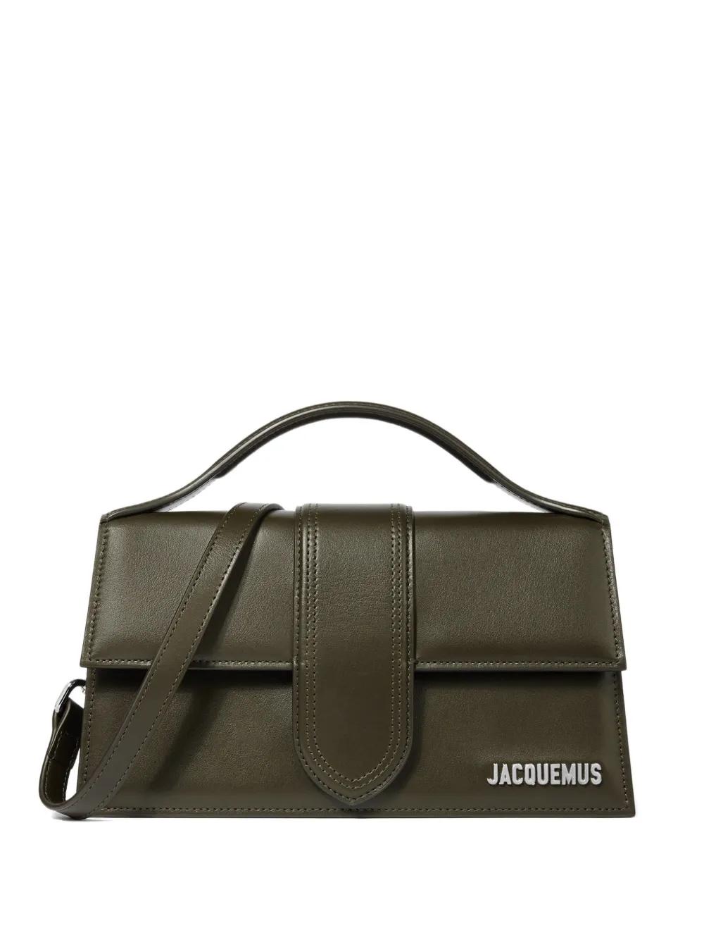 dark khaki top handle detachable shoulder strap silver-tone logo lettering flap closure rectangular shape