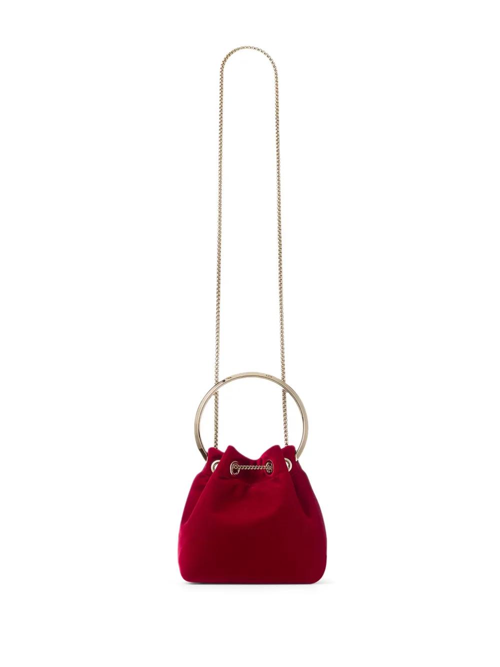 red velvet bucket body front toggle fastening single metallic top handle detachable chain-link shoulder strap metal eyelet detailing tassel detail main compartment internal logo plaque full lining
