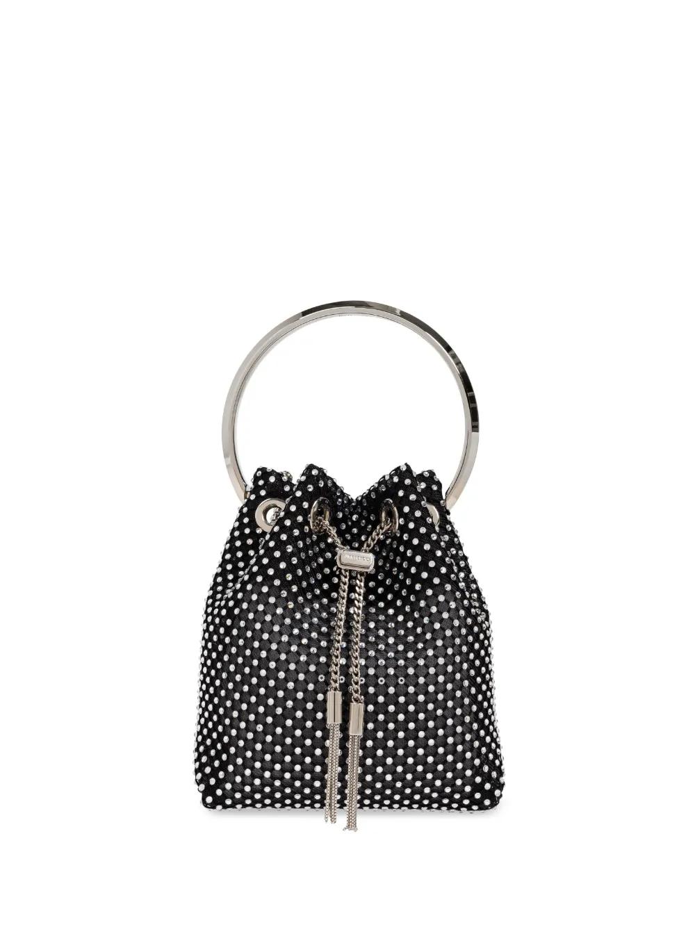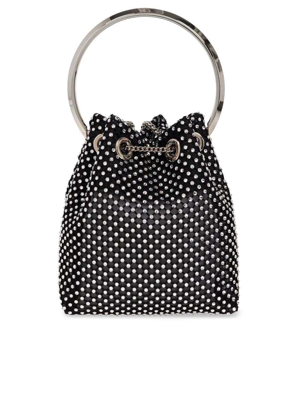 black mesh design drawstring fastening single circular top handle chain-link shoulder strap crystal embellishment logo-engraved silver-tone hardware