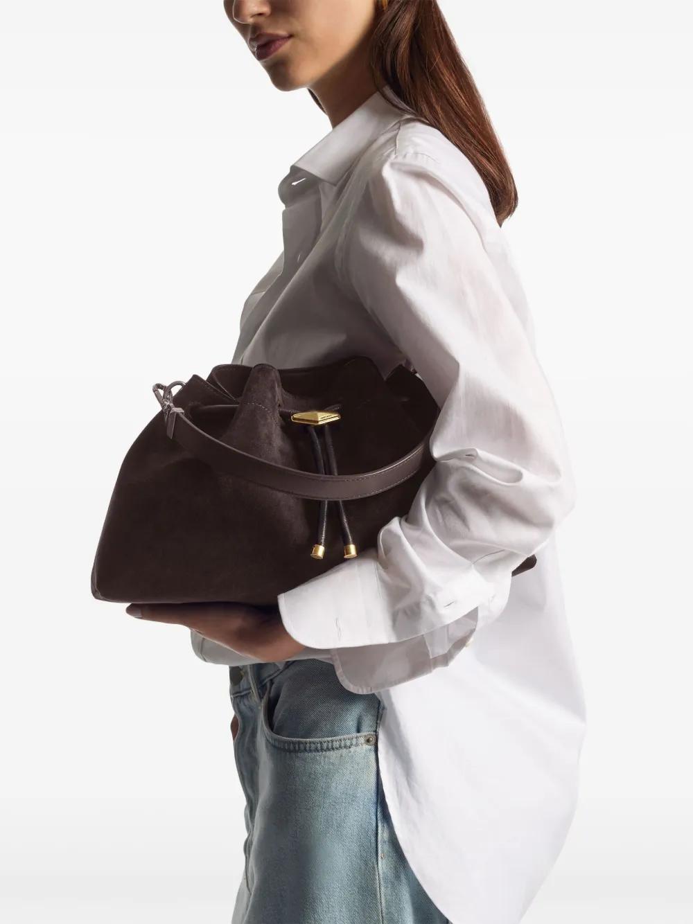 coffee brown calf suede top drawstring fastening adjustable top handle adjustable detachable shoulder strap debossed logo to the front logo-engraved gold-tone hardware main compartment Wardrobe Icon