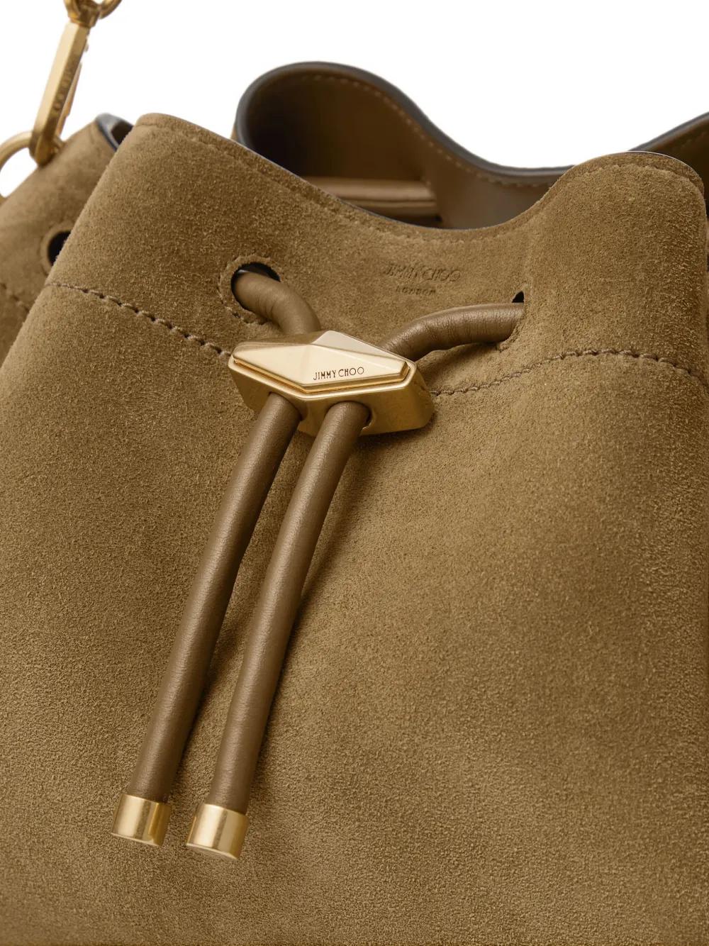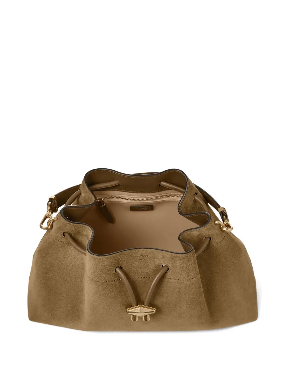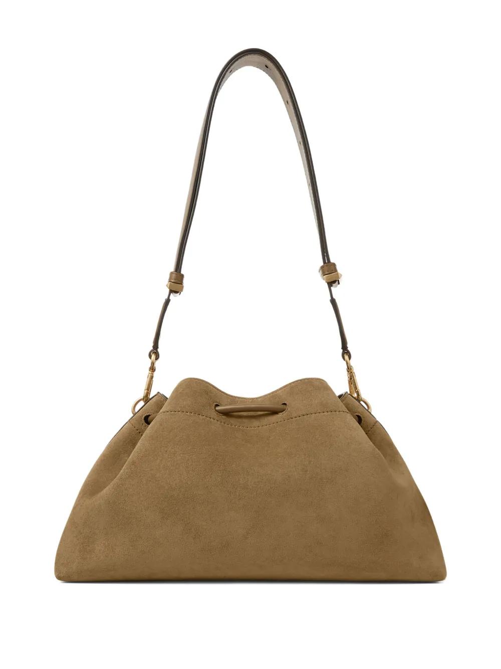 brown suede drawstring closure top handle detachable shoulder strap