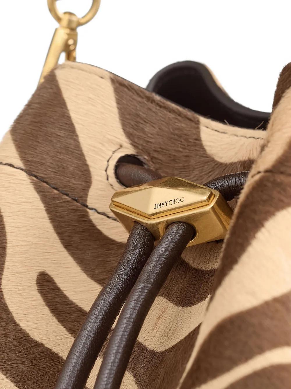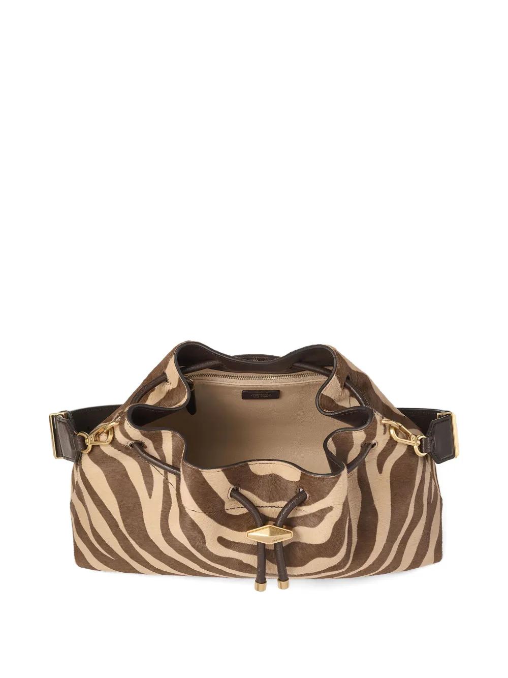 beige and brown zebra print drawstring closure top handle detachable shoulder strap gold-tone hardware This piece comes complete with a protective dust bag.