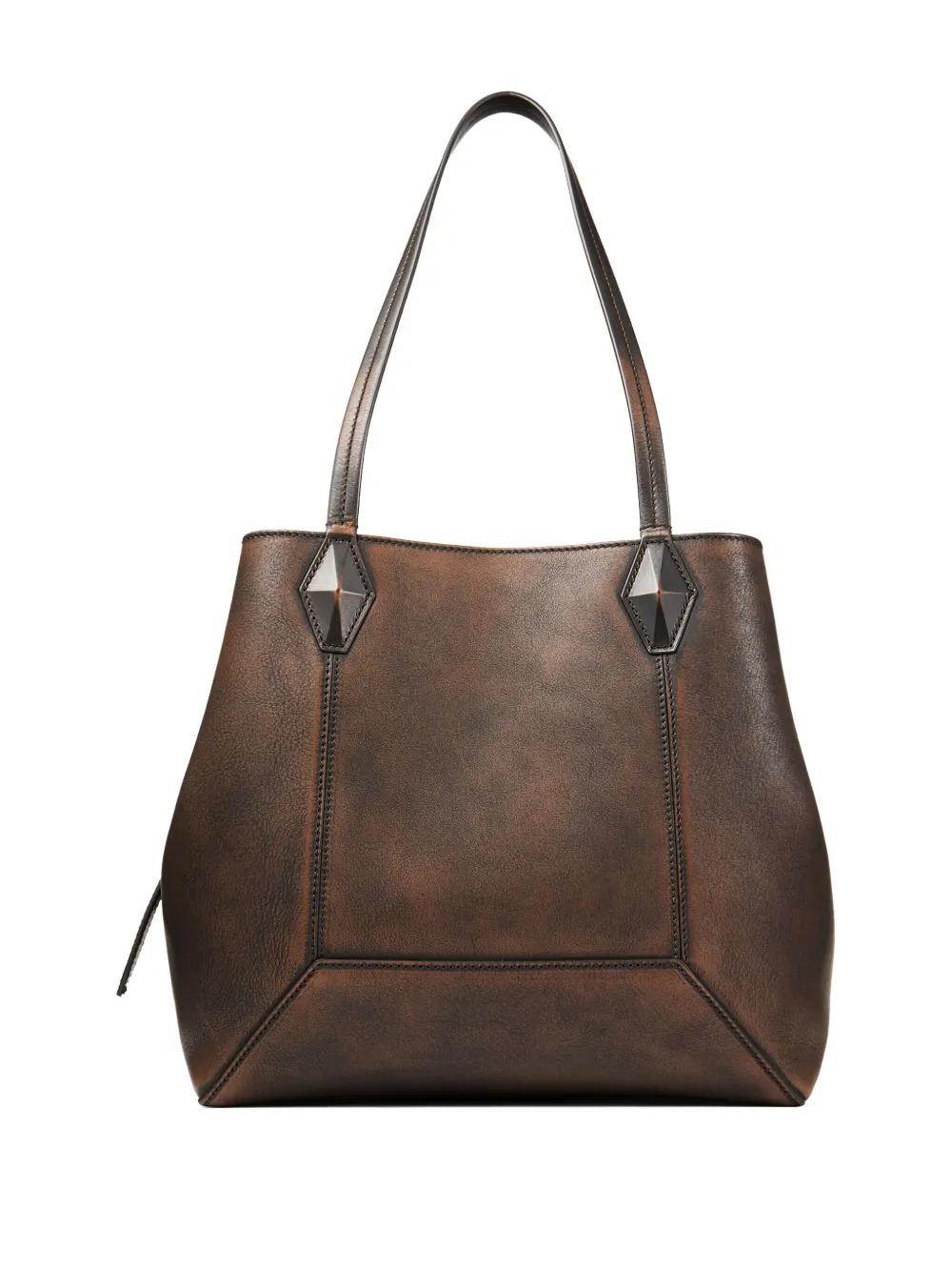 chocolate brown leather two top handles geometric panel design This piece comes complete with a protective dust bag.