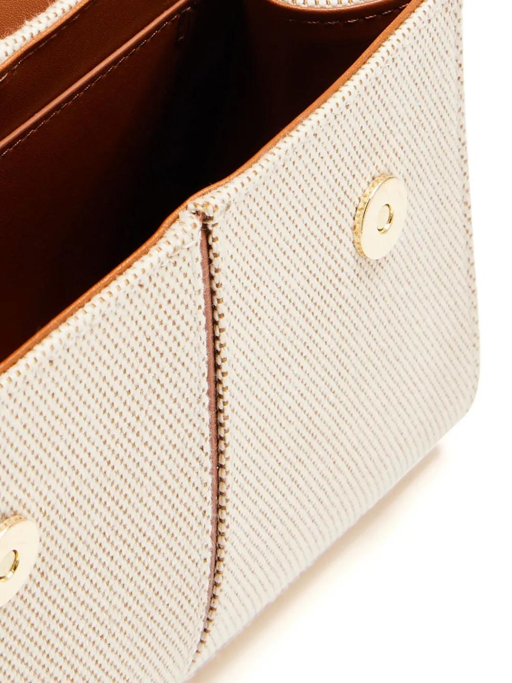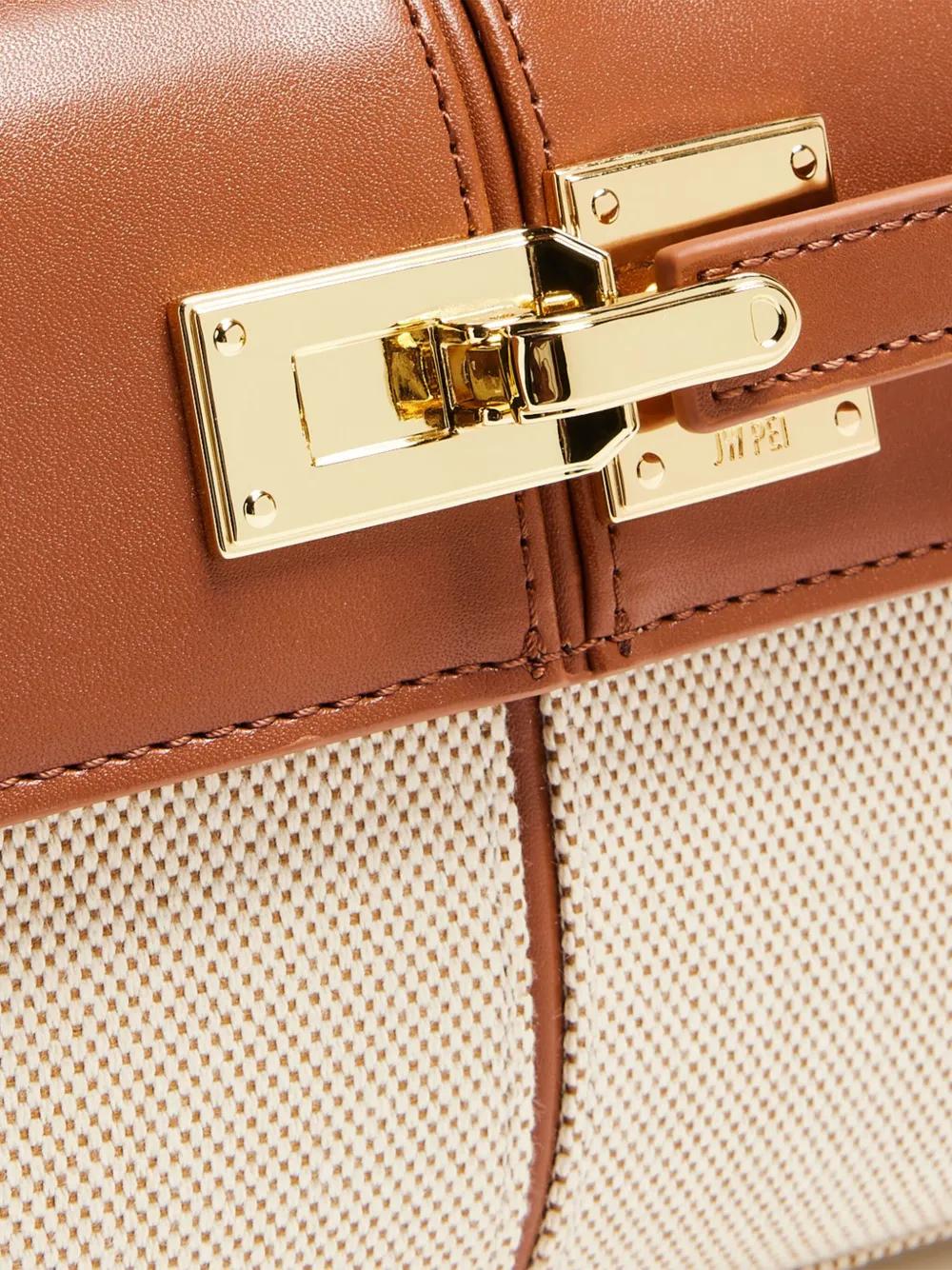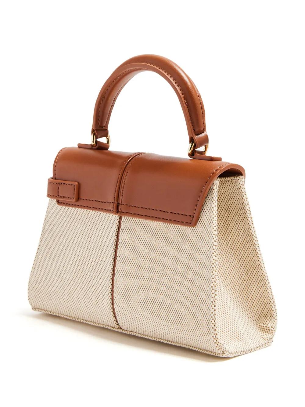 ecru/camel brown panelled design foldover top with magnetic fastening front buckle fastening with side strap detailing single rolled top handle adjustable detachable shoulder strap faux-leather trim metal feet main compartment internal slip pocket faux-leather lining