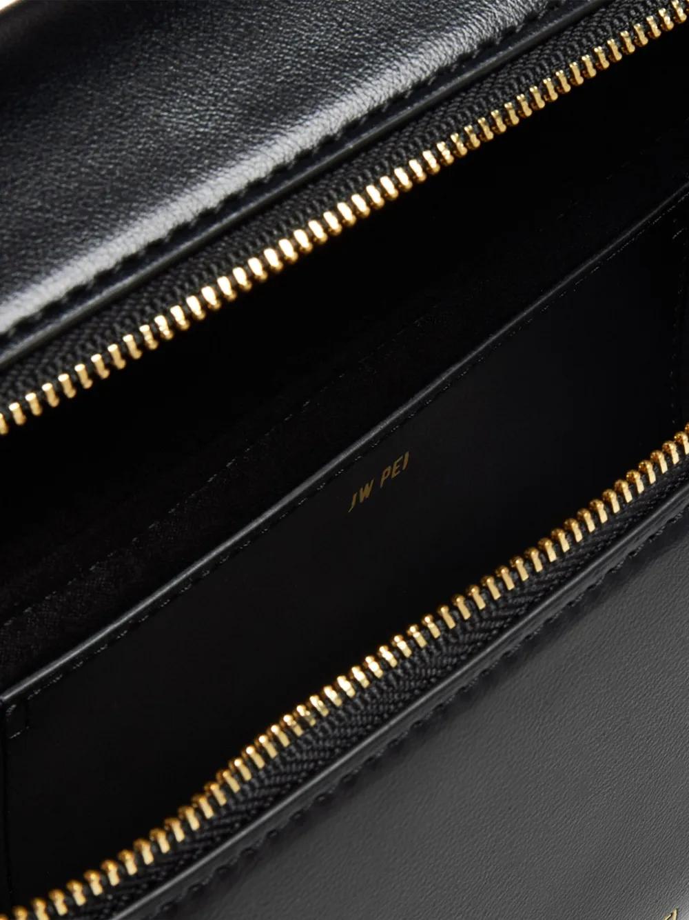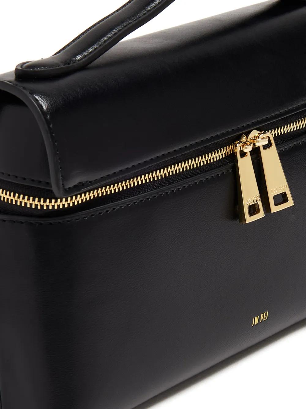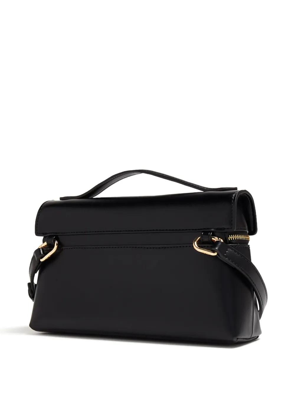 black artificial leather all-around zip fastening single top handle adjustable detachable shoulder strap logo stamp to the front gold-tone hardware main compartment internal pocket