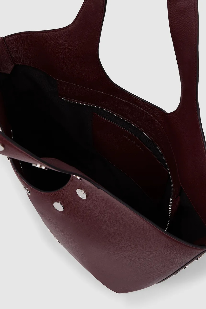 - Model z ćwiekami. - Długie uchwyty dla komfortowego noszenia w dłoni lub na ramieniu. - Mieści format A4. - Głębokość: 14 cm. - Wysokość: 37,5 cm. - Szerokość u podstawy: 50 cm.