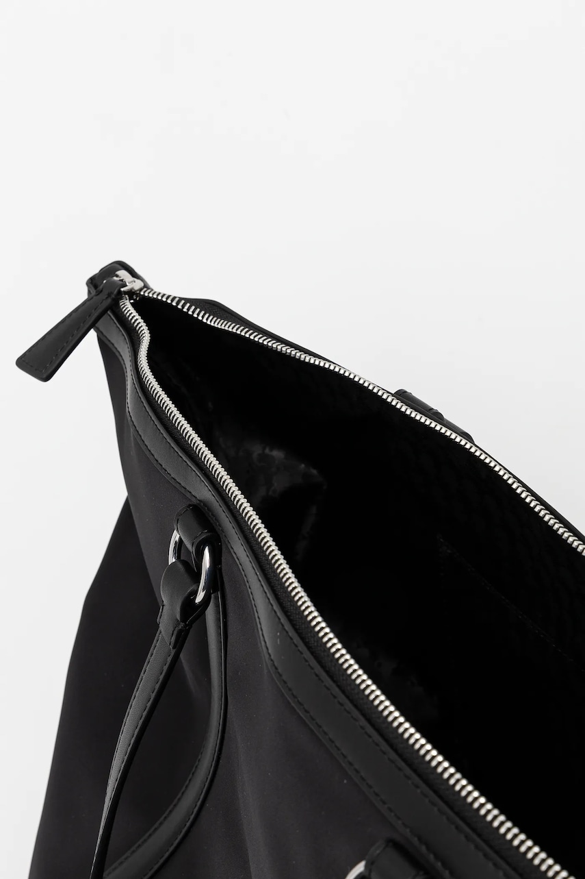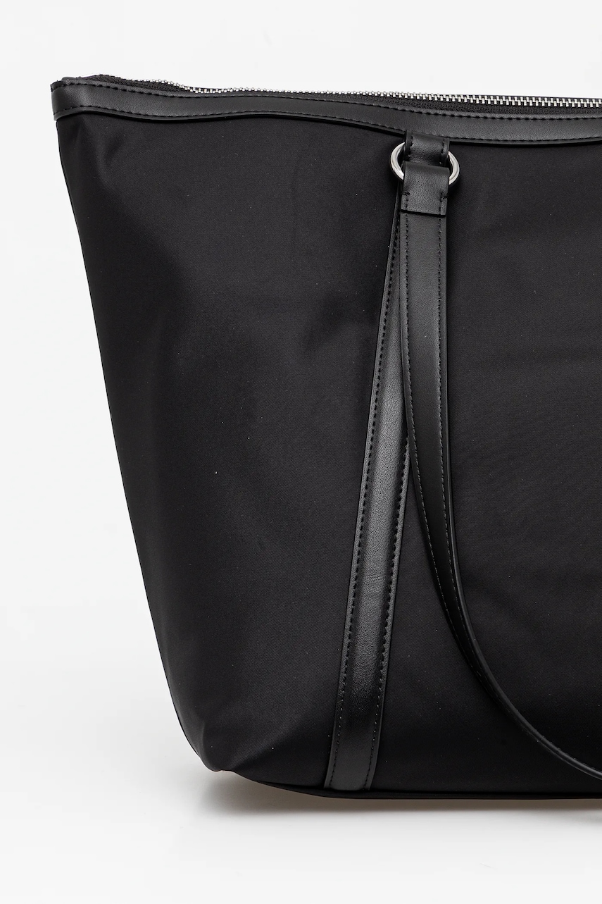 - Ten produkt został częściowo uszyty z poliamidu z recyklingu. - Komora główna zapinana na suwak. - Trzy kieszonki wewnętrzne: jedna zapinana na suwak, dwie wsuwane. - Długie uchwyty dla komfortowego noszenia w dłoni lub na ramieniu. - Z przodu logo marki. - Mieści format A4. - Szerokość u podstawy: 32 cm. - Wysokość: 30,5 cm. - Głębokość: 19 cm, - Długość uchwytu: 26,5 cm.