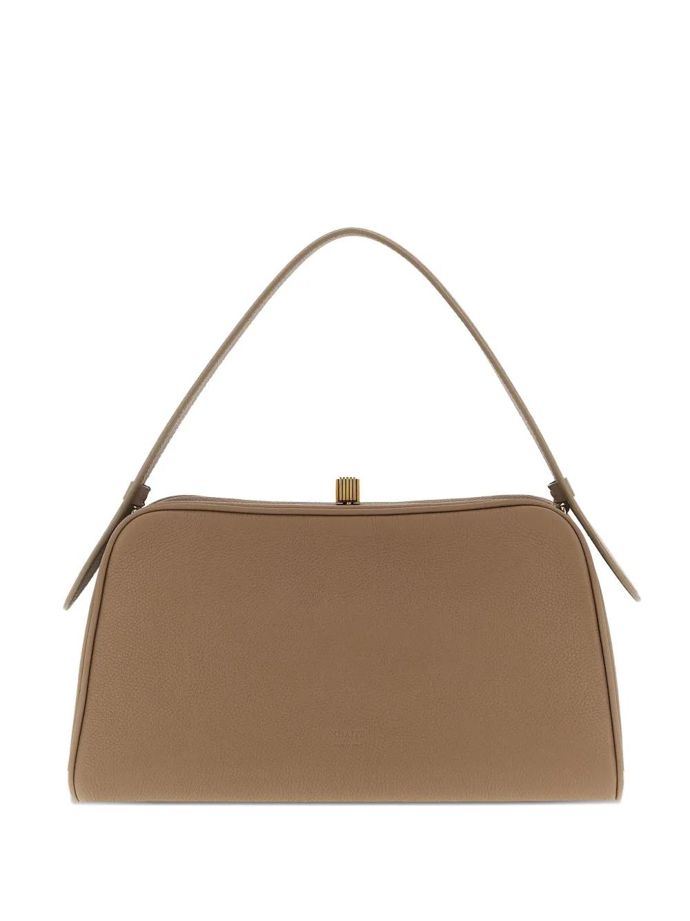 beige hammered leather embossed logo fixed handle kiss-lock closure gold-tone plating side gussets